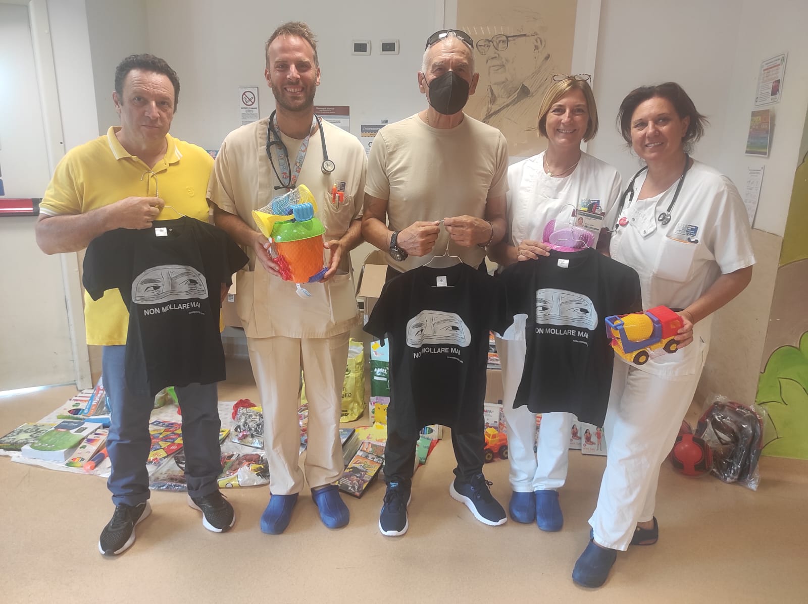 LIVORNO, 26 luglio 2023 – Il Comandante Alfa, celebre fondatore del Gruppo Intervento Speciale (Gis) dell'Arma dei Carabinieri ha consegnato personalmente al reparto di Pediatria dell’ospedale di Livorno, giochi, puzzle, libri e le nuove specialissime magliette a lui dedicate ai piccoli pazienti ricoverati con l’augurio di pronta guarigione. Ad organizzare l’evento una squadra consolidata formata dai promotori locali dell’iniziativa, Paolo Iovino con la famiglia al completo, la moglie Irene Pazzagli la figlia Matilde.