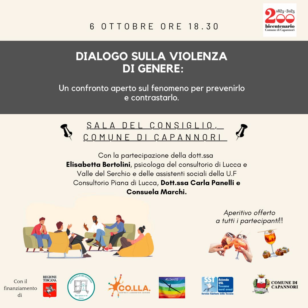 Capannori, 5 ottobre 2023 - Domani, venerdì 6 ottobre, alle ore 18.30, nella sala del consiglio comunale di Capannori si terrà un ‘Dialogo sulla violenza di genere’ promosso dal Comune nell’ambito del progetto ‘CO.LLA (Centro e Laboratori Giovani) insieme all’Azienda USL Toscana nord ovest e all’associazione Aeliante. All’incontro interverranno Elisabetta Bertolini, psicologa del Consultorio di Lucca e Valle del Serchio e le assistenti sociali del Consultorio della Piana di Lucca Carla Panelli e Consuela Marchi. All’incontro interverrà anche Alida Bondanelli, presidente della Commissione Pari Opportunità di Capannori.