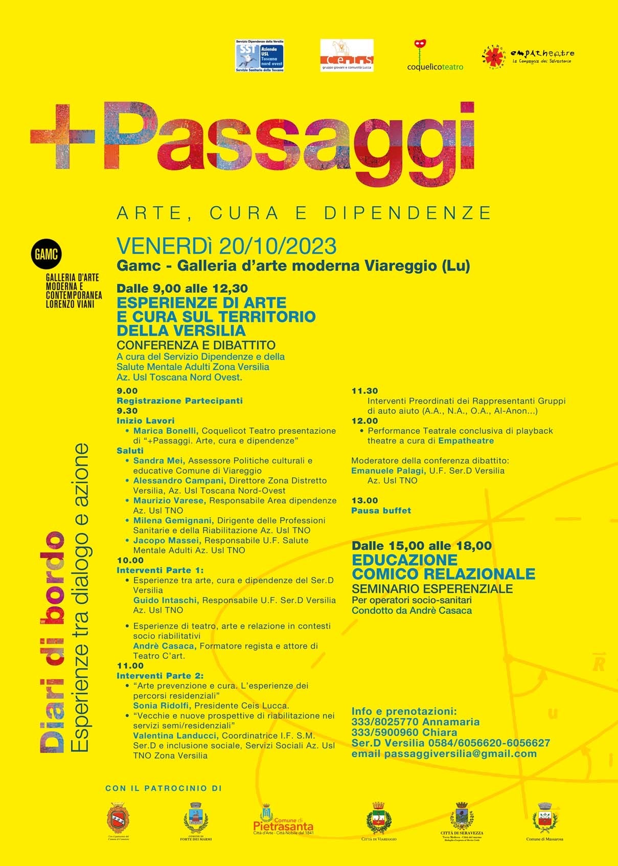 Si è chiuso venerdì 20 ottobre 2023, alla Galleria comunale di arte moderna e contemporanea (GAMC) di Viareggio, con una conferenza-dibattito ricca di spunti interessanti per i presenti, il percorso “+ Passaggi: esperienze di arte e cura nel settore dipendenze e salute mentale”, organizzato dal SerD della Versilia in collaborazione con il Ceis di Lucca e le associazioni Coquelicot Teatro ed Empatheatre all'interno delle attività del progetto aziendale Accordo Ceart “Il Ragno nella tela”, in corso di realizzazione proprio tra SerD Versilia e CEIS di Lucca.