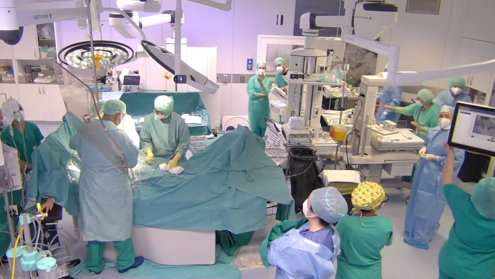 Il parto - altro dato che ne conferma l’eccezionalità - è avvenuto nella sala ibrida del nuovo blocco operatorio dell’Ospedale del Cuore. Quella sala, quasi 100 metri quadrati, consente la fusion imaging, ossia la sovrapposizione di immagini ecografiche e radiologiche: i radiologi interventisti hanno quindi potuto seguire sui monitor in sala il percorso delle sonde femorali inserite nelle arterie per evitare emorragie e accertare il corretto posizionamento. In sala anche gli anestesisti, i cardiologi e cardiochirurghi di Monasterio pronti ad intervenire in caso di scompenso o di problemi all’aorta, le ostetriche e i ginecologi per aiutare mamma e bambino, gli infermieri, i perfusionisti che si occupano di circolazione extracorporea, i tecnici di radiologia e gli operatori socio sanitari.