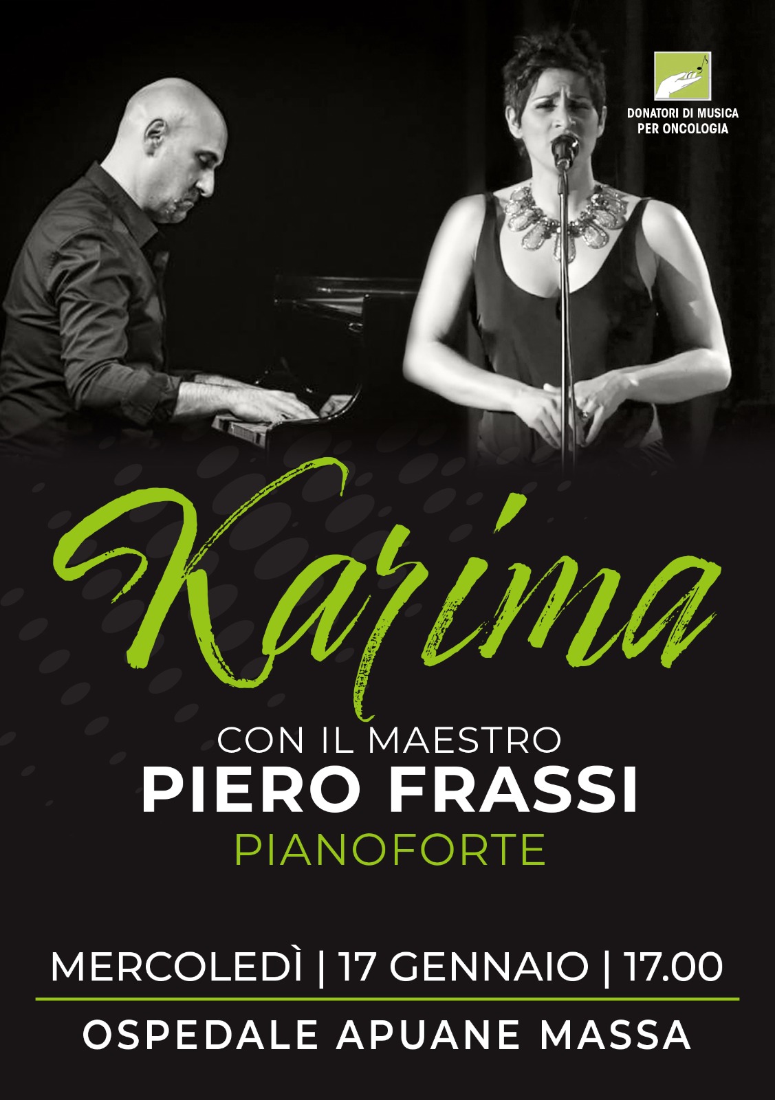 riservata ai pazienti oncologici, ai loro familiari, agli operatori sanitari e a tutti coloro che vogliono sentire buona musica lasciandosi trasportare dalle emozioni. Si tratta di una straordinaria occasione per ritrovarci insieme e apprezzare il talento e la generosità di Karima, artista di livello internazionale, e del grande pianista Piero Frassi ”.