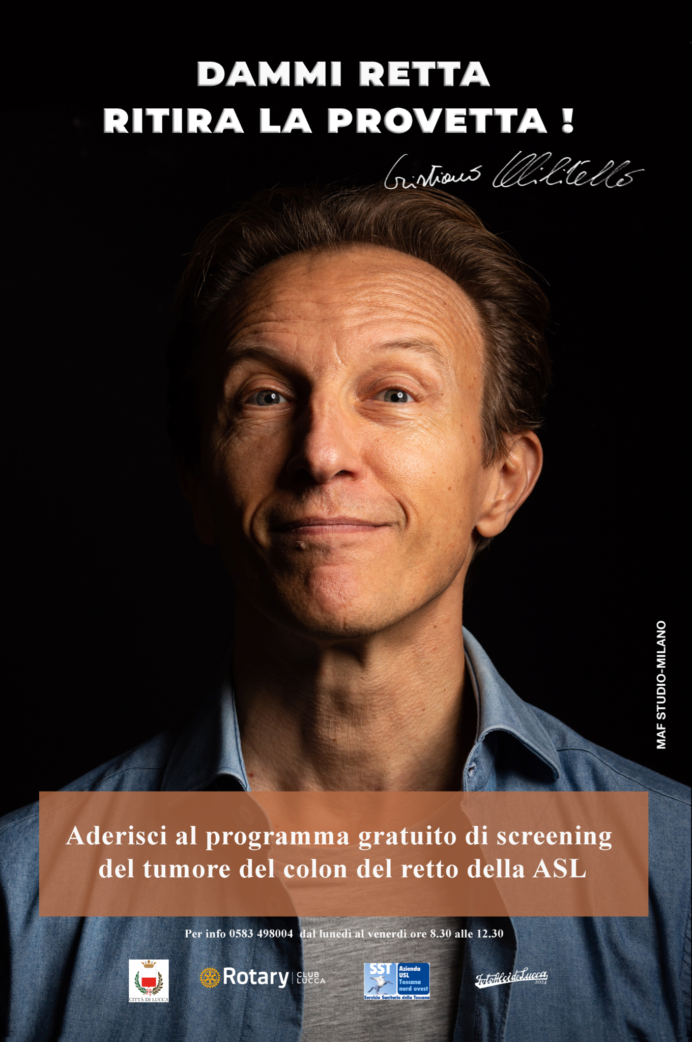 Lucca, 20 aprile 2024 - Parte a Lucca la campagna del programma gratuito di screening del tumore del colon del retto di Asl Toscana nord ovest realizzata con il sostegno del Comune di Lucca, Rotary Club Lucca, Foto Alcide Lucca e con un testimonial d'eccezione Cristiano Militello di Striscia la Notizia e Radio 101 che ha prestato il suo volto notissimo per diffondere un'iniziativa di prevenzione essenziale per prevenire o scoprire in tempo questa patologia pericolosa.