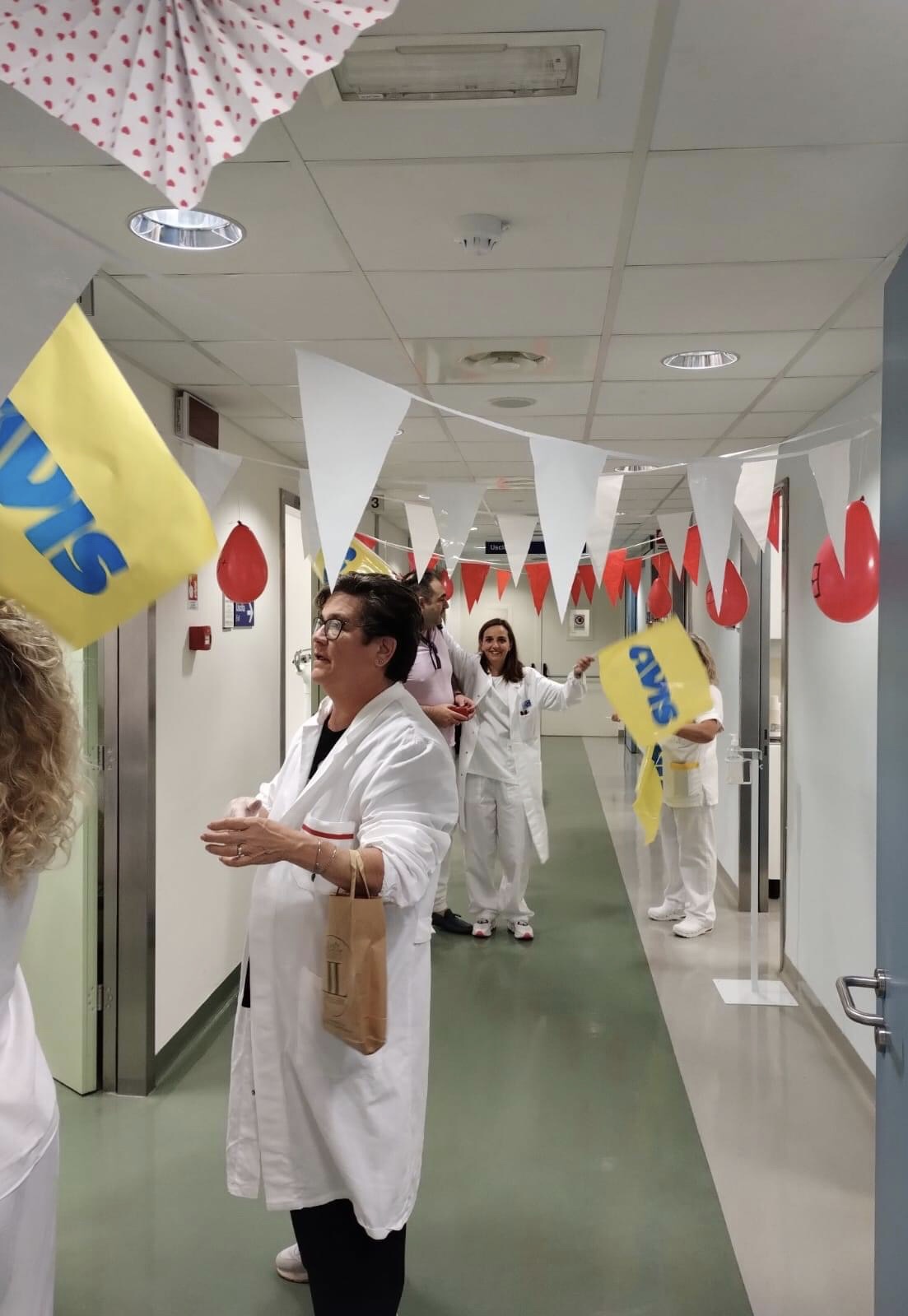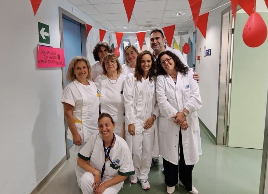 In foto la struttura di Lucca nella Giornata mondiale del donatore di sangue e la direttrice Rosaria Bonini insieme al gruppo della Medicina Trasfusionale di Lucca