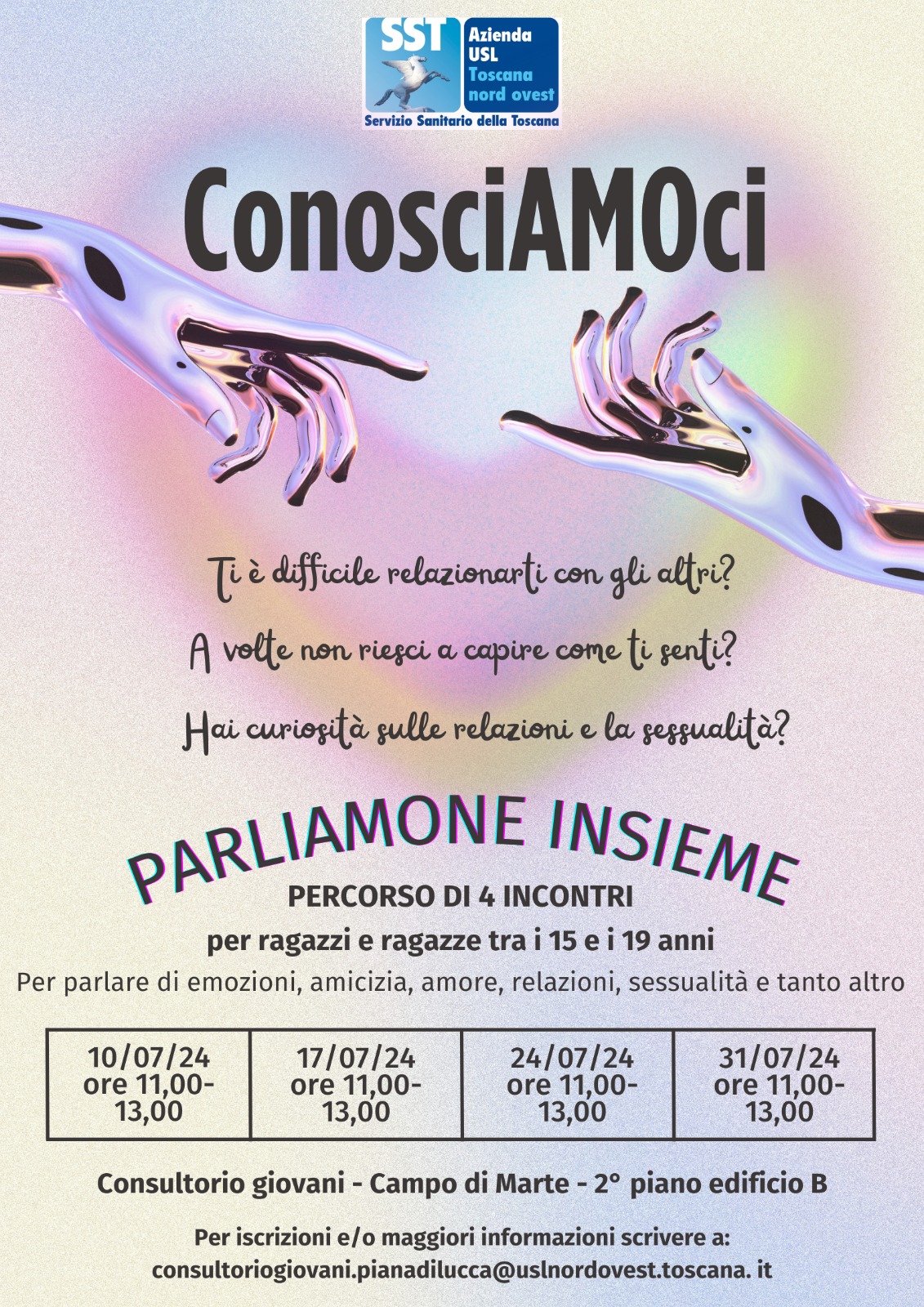 Lucca, 25 giugno 2024 – Partiranno mercoledì 10 luglio 2024 al Consultorio Giovani di Lucca, nella Cittadella della Salute “Campo di Marte” (secondo piano, edificio B) gli incontri di gruppo riservati alle ragazze e ai ragazzi di età compresa tra 15 e i 19 anni. L’iniziativa, dal titolo “ConosciAMOci”, ha l’obiettivo di incontrare gli adolescenti per parlare con loro di emozioni, relazioni e sessualità.