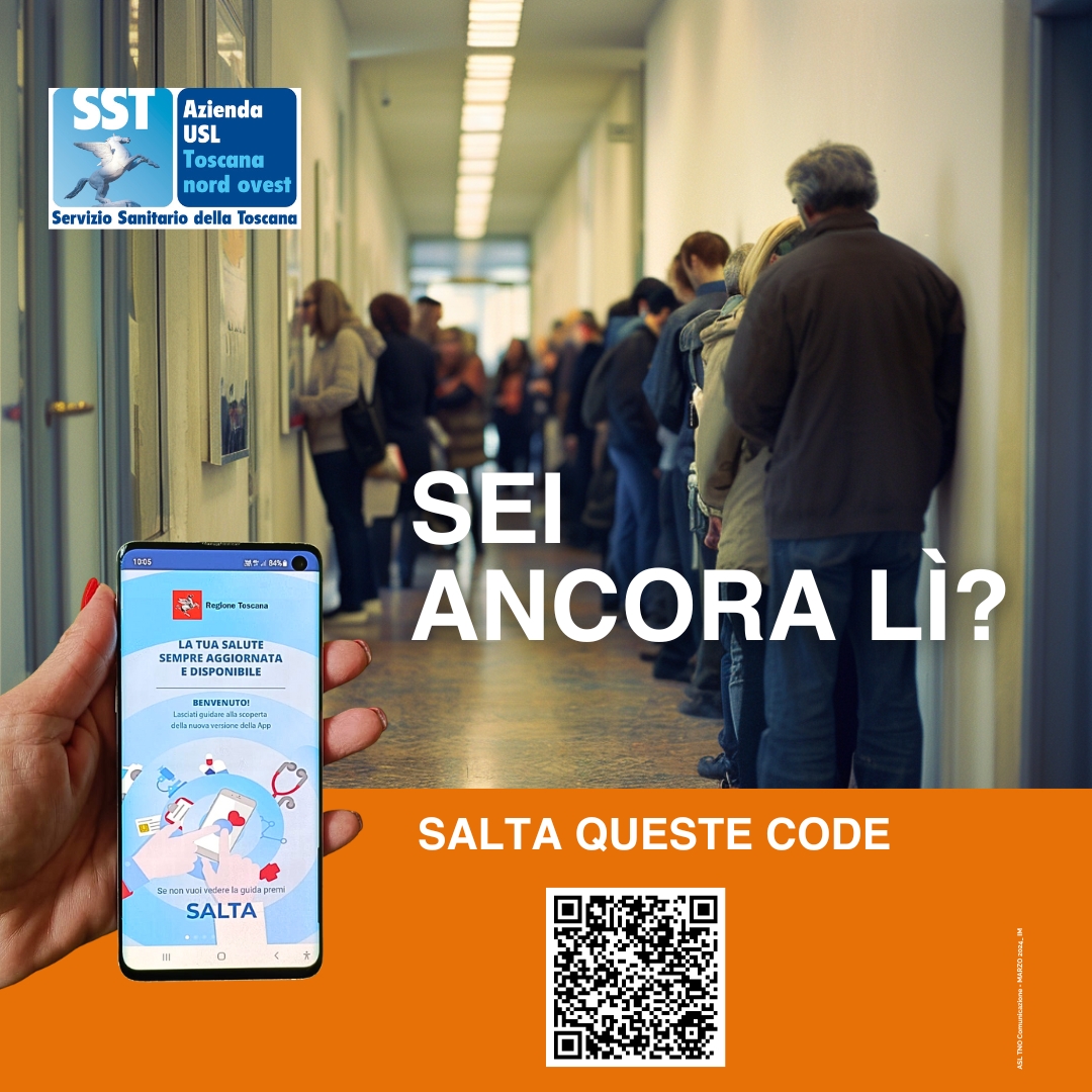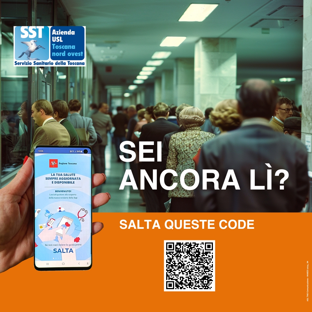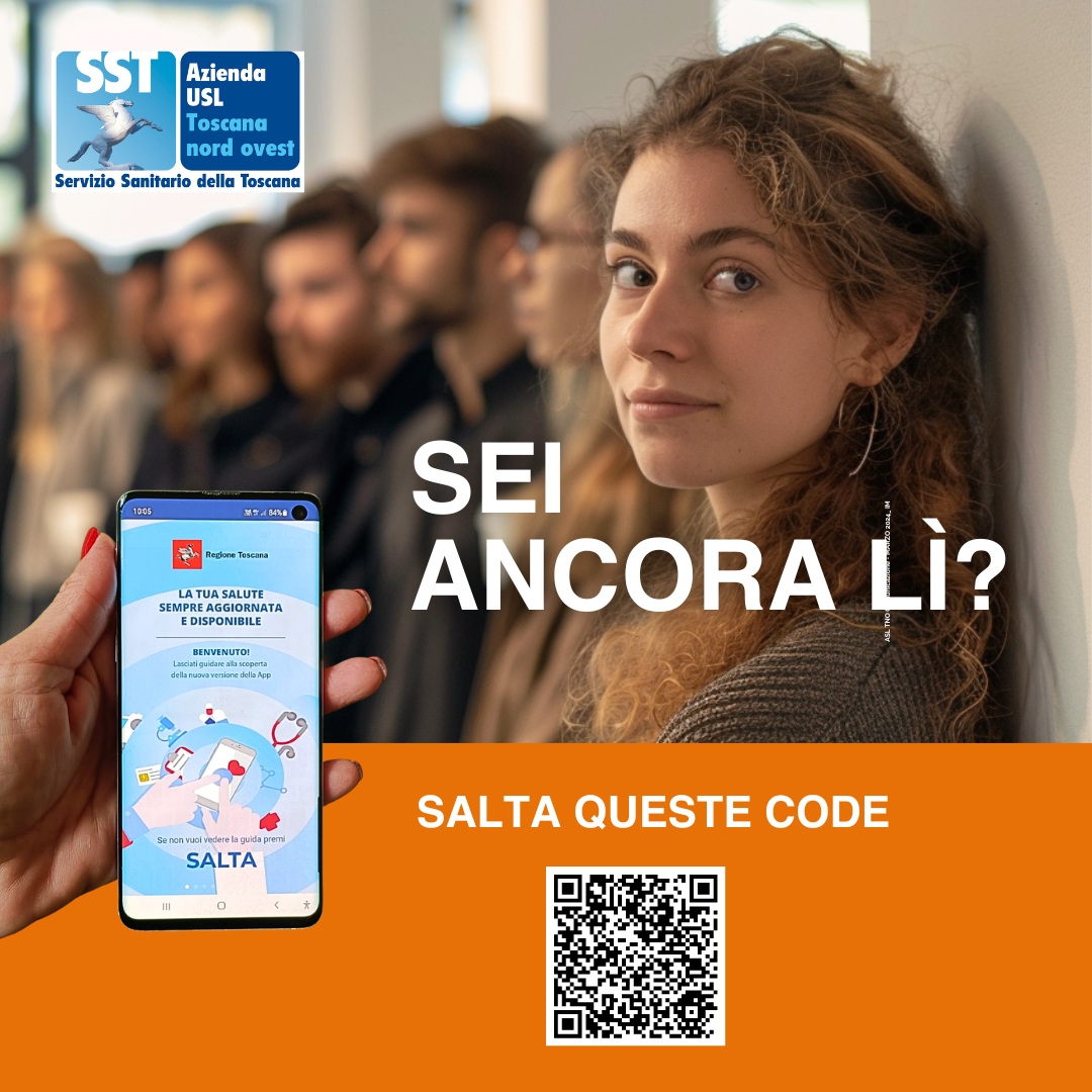 Pisa, 26 giugno 2024. "Sei ancora lì?". L'Azienda USL Toscana nord ovest prosegue la campagna per informare i propri utenti su quante code agli sportelli si possono evitare utilizzando i servizi on line. Ad oggi, infatti, sono oltre trenta i servizi e i percorsi, regionali e aziendali, fruibili direttamente, e comodamente, da casa senza fare code: dalla prenotazione delle analisi del sangue e delle visite specialistiche, al cambio del medico di famiglia; dal pagamento dei ticket alla consultazione dei referti, delle ricette e del libretto di gravidanza; dalla richiesta della cartella clinica o della riparazione di ausili e protesi, alla richiesta di un trasporto per fragilità socio-economica fino ai buoni acquisto per celiaci.