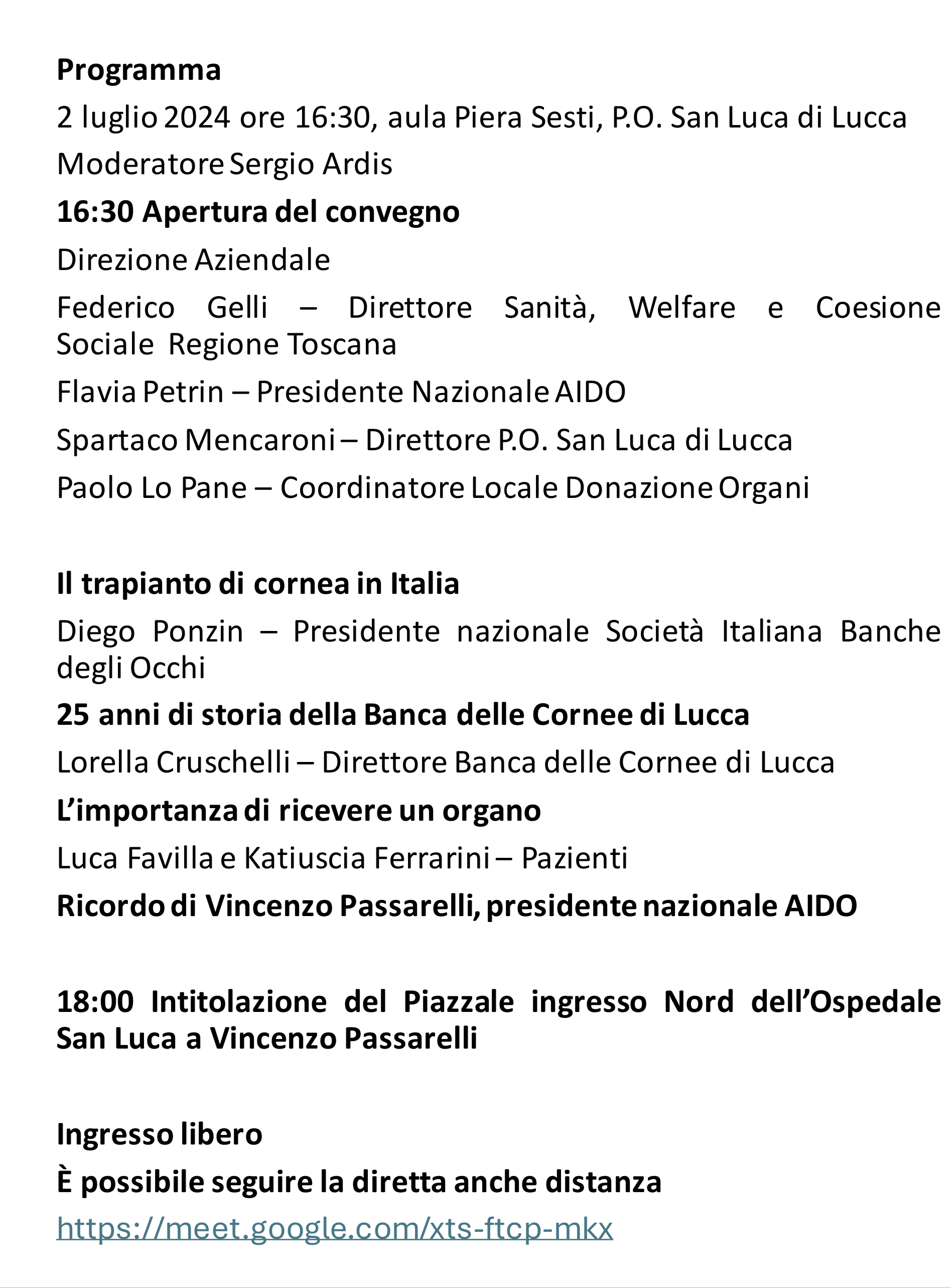 In allegato due immagini della Banca delle Cornee di Lucca e il programma della giornata