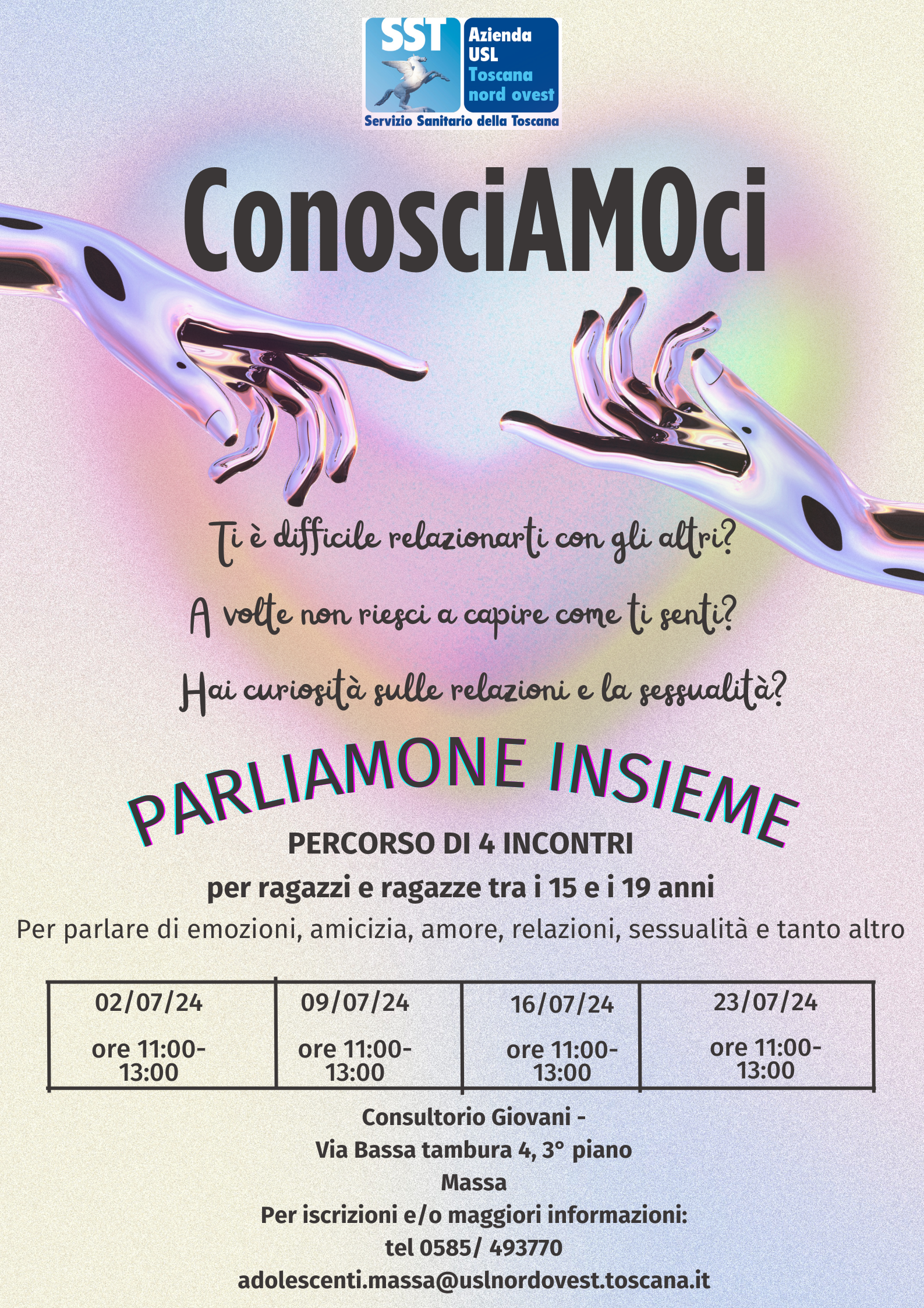 Massa Carrara, 1 luglio 2024 - Partirà martedì 2 luglio al Consultorio Apuane diretto da Giovanna Casilla, l'iniziativa dal titolo “ConosciAMOci” con l'obiettivo di incontrare gli adolescenti per parlare con loro di emozioni, relazioni e sessualità. Si tratta di incontri di gruppo riservati alle ragazze e ai ragazzi di età compresa tra i 15 e i 19 anni.
