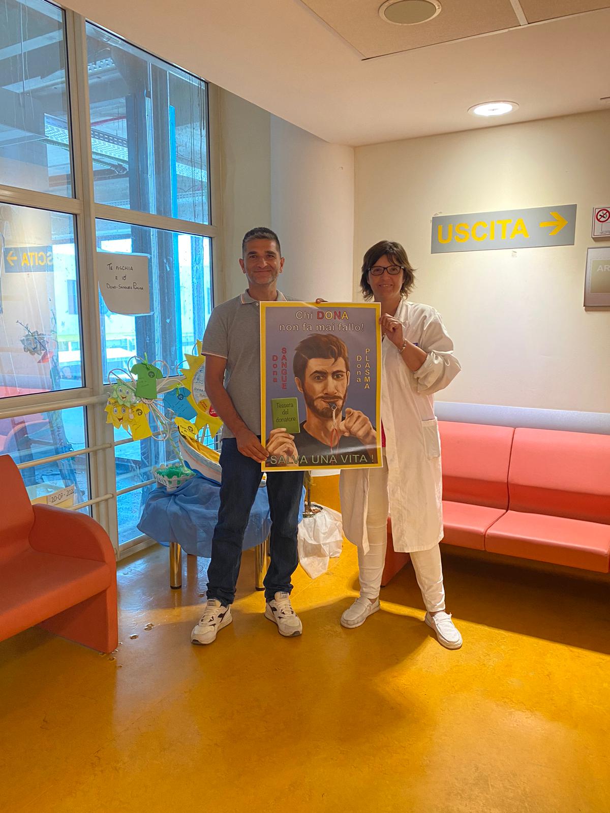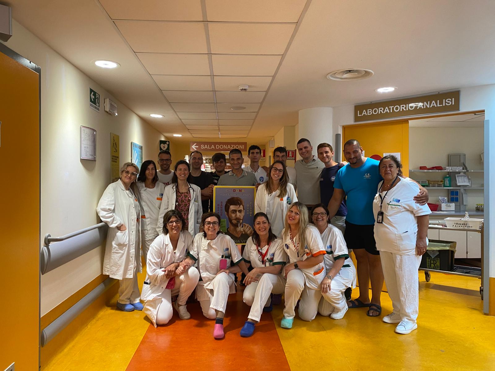 In foto la dottoressa Pappalardo e il personale del Trasfusionale con il presidente della Sezione Arbitri di Pontdera, Davide Vitolo.