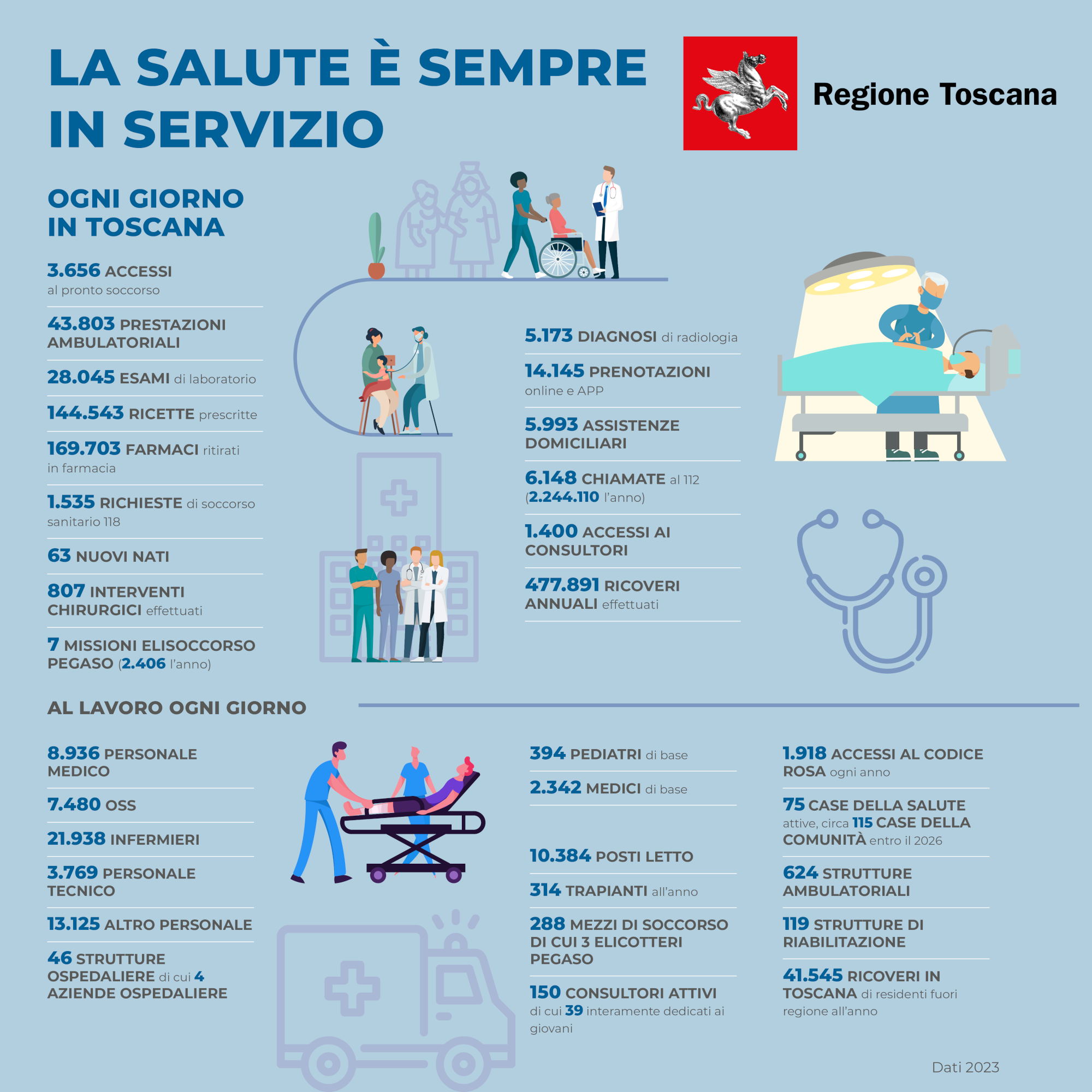 FIRENZE, 2 agosto 2024 - “Anche i numeri dimostrano quanto impegno e quante attività ci siano dietro il nostro sistema sanitario e quanto siano capillari gli interventi effettuati”. Così il presidente della Regione Eugenio Giani e l’assessore alla sanità Simone Bezzini commentano la fotografia statistica che è stata elaborata dagli uffici regionali per sintetizzare le dimensioni del lavoro svolto ogni giorno dal sistema sanitario della nostra regione.