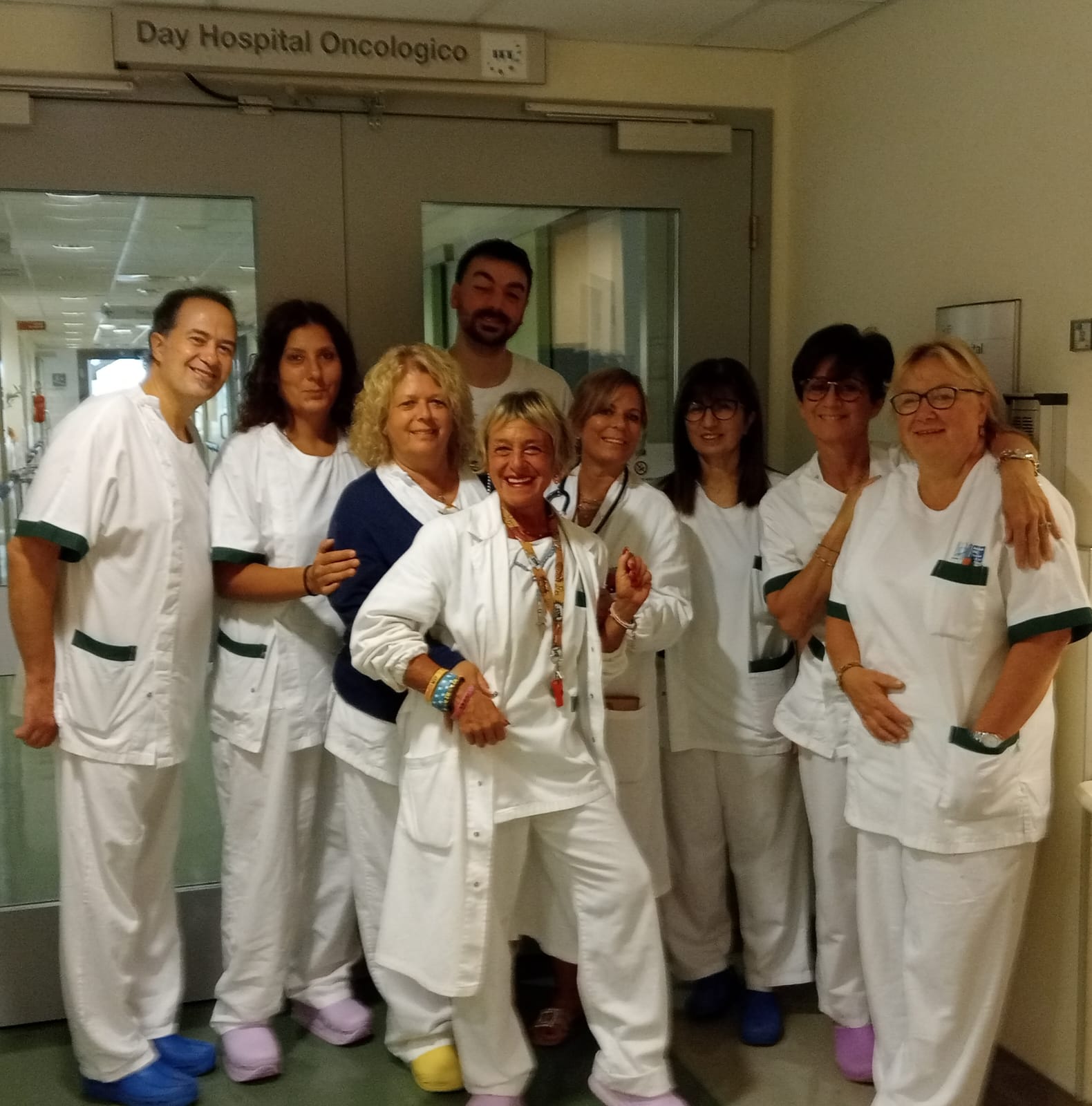 In foto la dottoressa Tanganelli e con il personale del Day Hospital Oncologico del “San Luca”