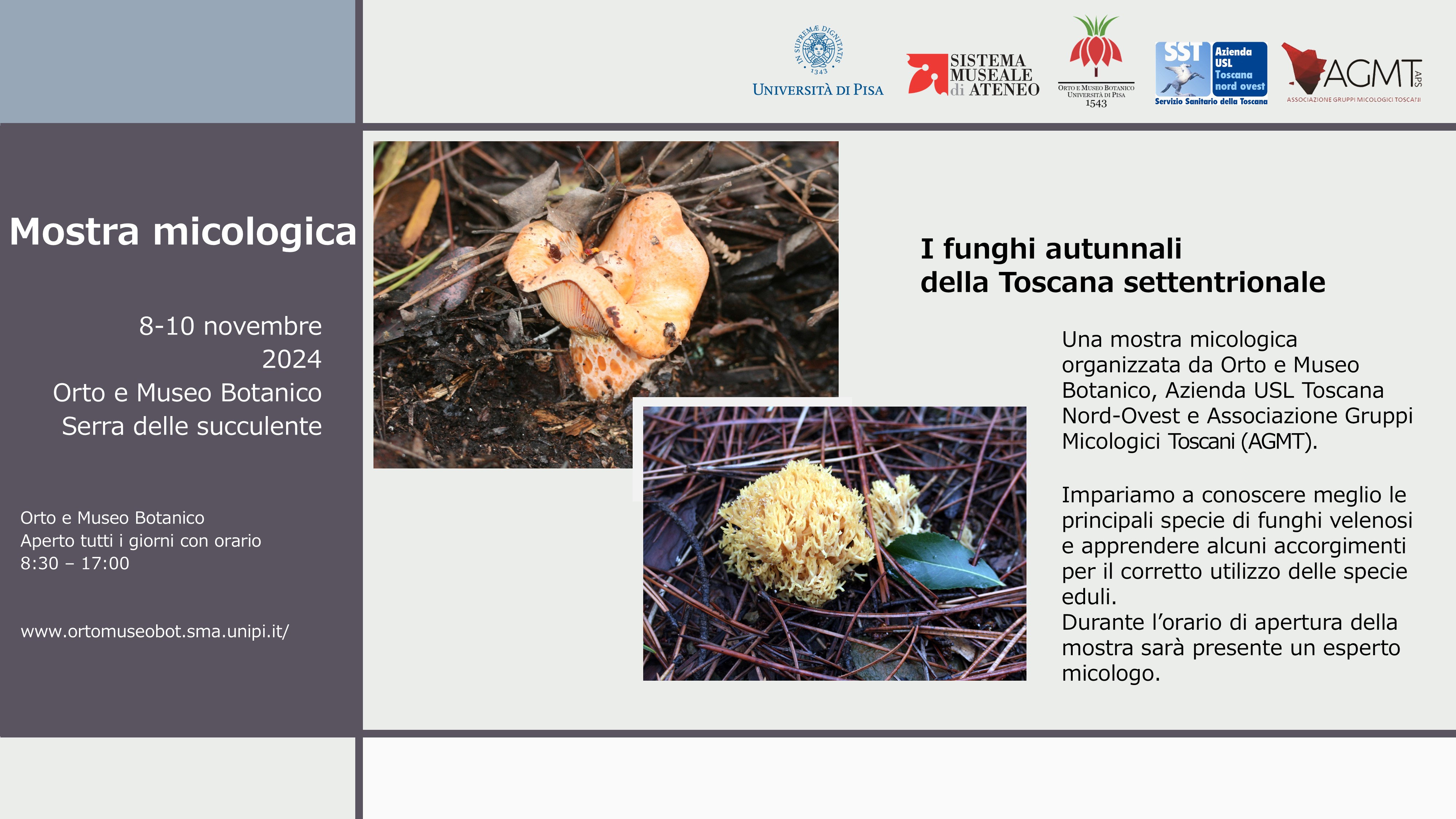 Dalle 8:30 alle 17, l'orto ospiterà la mostra micologica "I funghi autunnali della Toscana settentrionale", organizzata dal Museo botanico, dall'Azienda USL Toscana nord ovest e dall'Associazione gruppi micologici toscani.