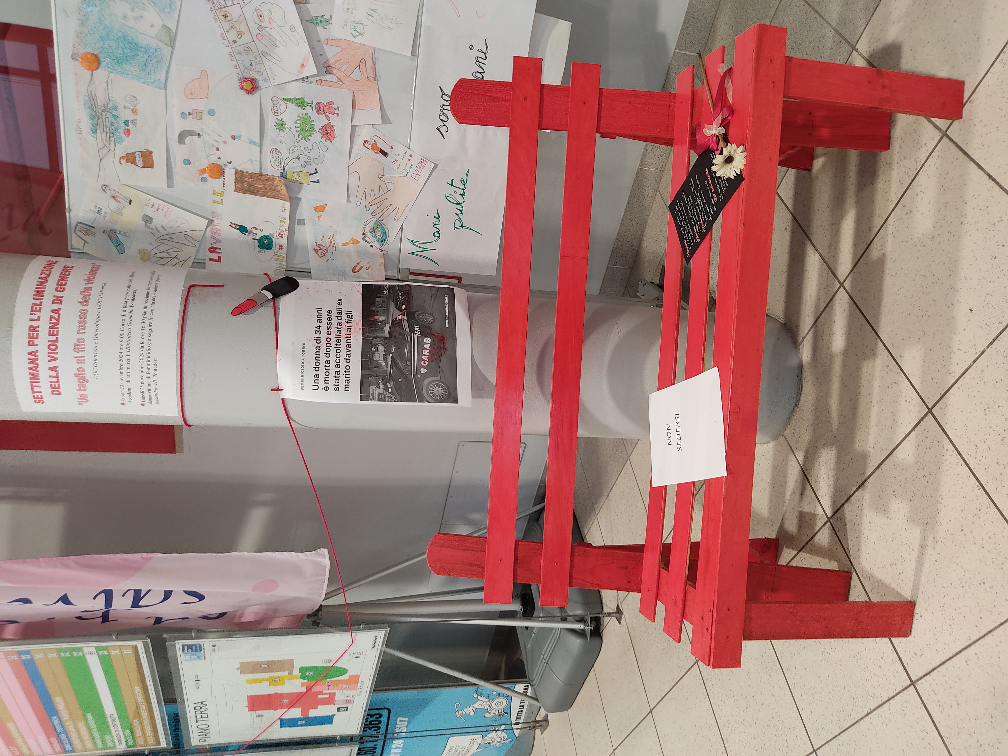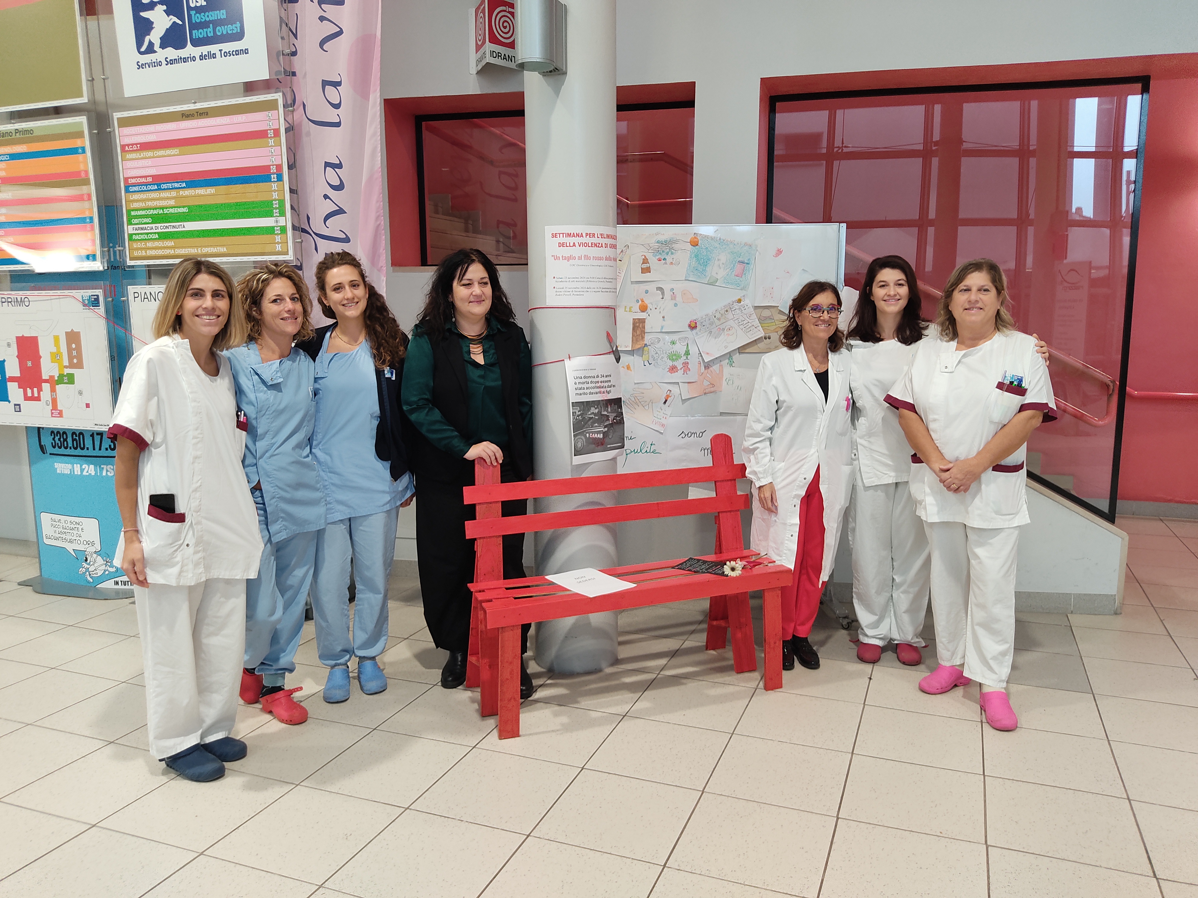 Pontedera, 20 novembre 2024. L'ospedale "Lotti" di Pontedera si prepara a celebrare la "Giornata internazionale per l'eliminazione della violenza sulle donne" con una installazione che dall'atrio dell'ospedale si dipana fino al reparto di ostetricia. Basta seguire il rosso. Nello specifico il filo rosso che dalla panchina contro la violenza sulle donne, anch'essa rossa, allestita nell'atrio dell'ospedale, conduce all'ingresso del reparto di ostetricie e ginecologia. Qui un paio di forbici, ovviamente rosse, tagliano il filo della violenza che ha accompagnato il visitatore tra la cronaca quotidiana dei femminicidi e l'impegno delle donne per contrastare questo fenomeno.