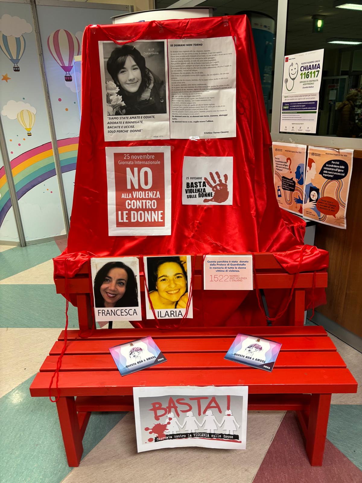 CECINA, 22 novembre 2024 – Nell’atrio del presidio ospedaliero di Cecina è stata allestita una panchina rossa come invito alla riflessione in vista della giornata internazionale per l'eliminazione della violenza contro le donne celebrata ogni anno il 25 novembre.