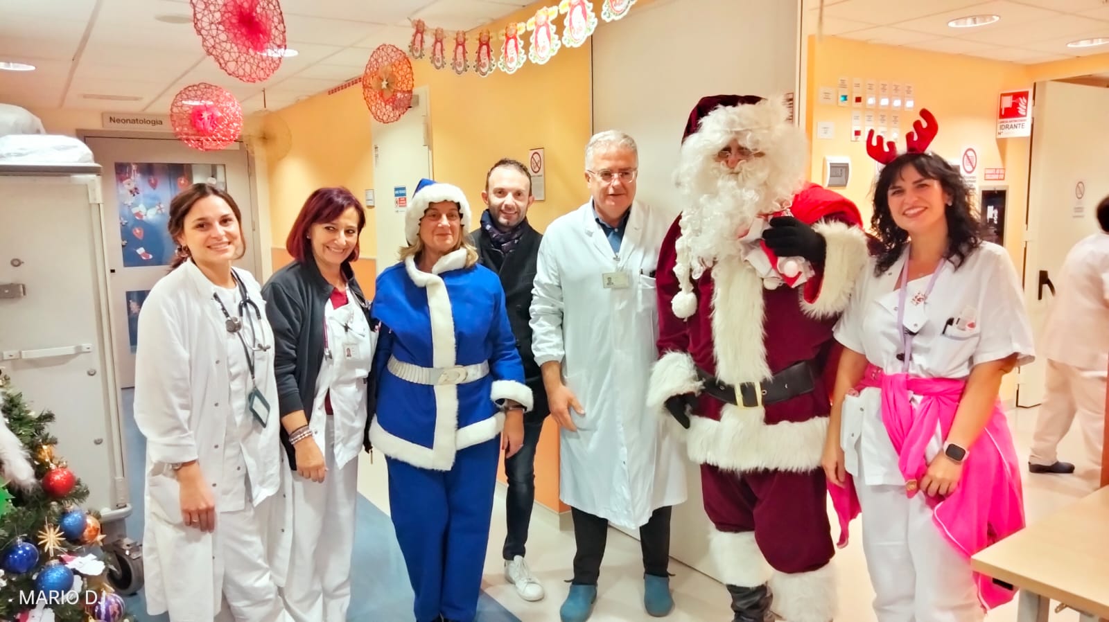 con il suo sacco pieno di doni, pronti per essere consegnati ai piccoli pazienti, sotto gli occhi felici delle loro mamme.