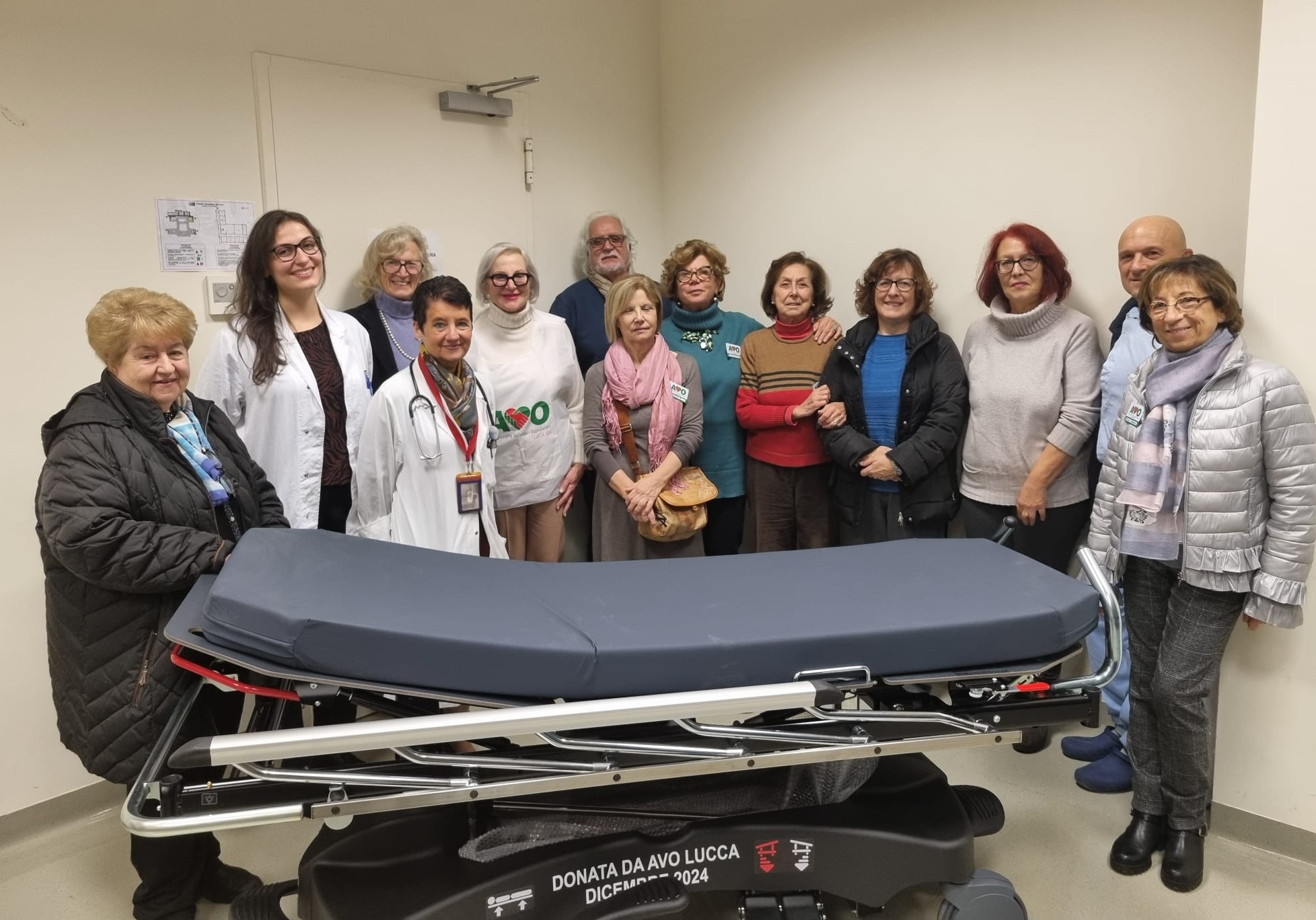Alla consegna ufficiale della nuova barella c’erano la presidente dell’AVO di Lucca Simonetta Fioravanti, accompagnata da tutto il consiglio dell’associazione. Era presente anche Fiorenza Fanicchi per l’AVO regionale.