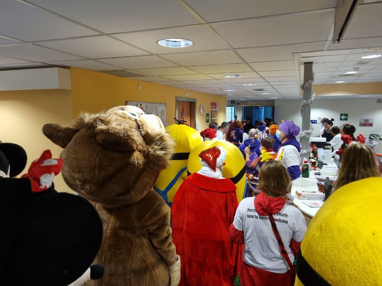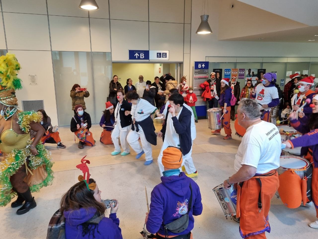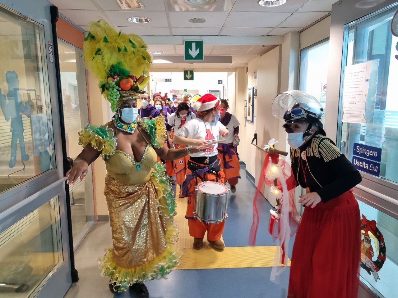Il coloratissimo gruppo si è recato in Pediatria, per la gioia dei piccoli ricoverati, mentre - prima e dopo la visita nel reparto pediatrico - ci sono stati i tradizionali canti e balli nella hall dell’ospedale.