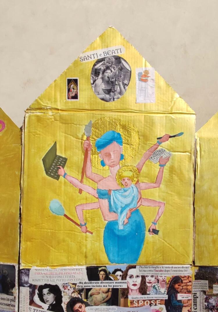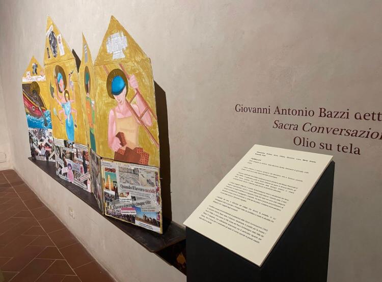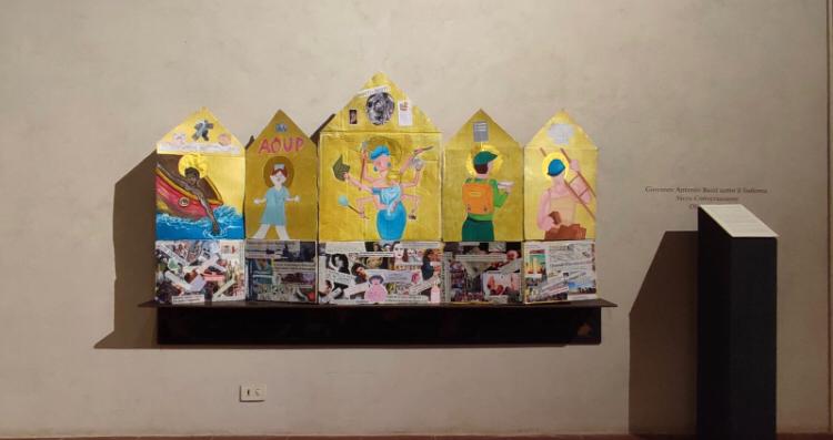 "Si tratta di un'opera collettiva - aggiunge Cantoresi - che, partendo dall'analisi dei polittici medievali presenti all'interno del museo, ha rielaborato questo genere di arte in chiave contemporanea. L'opera, infatti, è realizzata con materiali poveri, in cartone, tempera e colla vinilica e arricchita da inserti di carta alluminio dorata e frammenti di giornale applicati tramite la tecnica del collage. E' larga 2,2 metri, alta 1,1 metri ed è composta da cinque scomparti pieghevoli. In ogni scomparto è raffigurata una figura: l'operaio edile, il rider, la madre tuttofare, l’infermiera e il migrante in balia del mare. Nella reinterpretazione laica e attualizzata, questi personaggi vogliono rappresentare i santi e i martiri della società odierna, le categorie sociali e professionali svantaggiate e svalutate, che sono allo stesso tempo vere e proprie personificazioni di tematiche attuali, come la sicurezza e i diritti dei lavoratori, il sistema socio-sanitario, i fenomeni migratori e il ruolo della donna. L'attualità dei temi è rafforzata dal collage che decora la predella, in cui campeggiano titoli di giornale e immagini tratte da quotidiani e riviste".