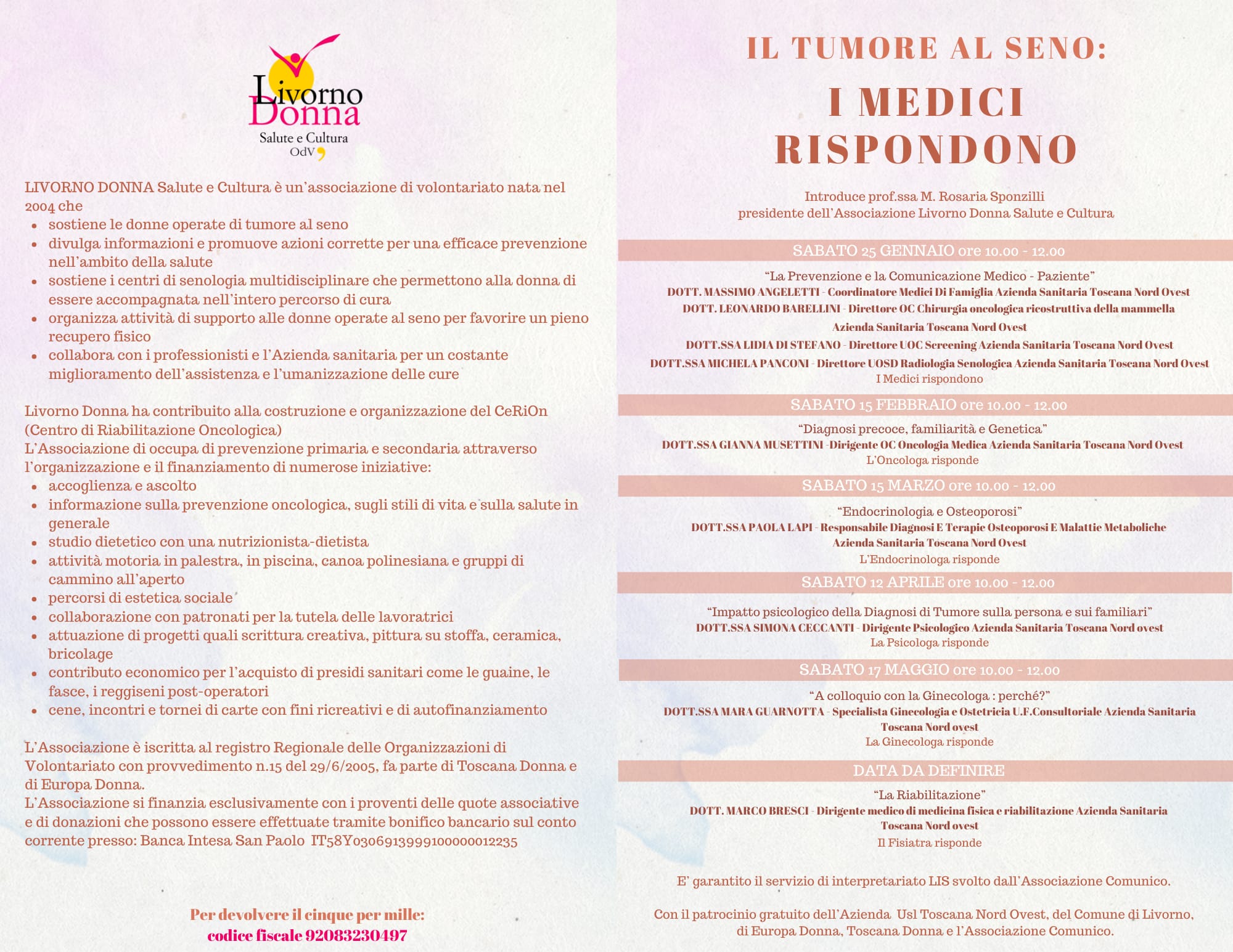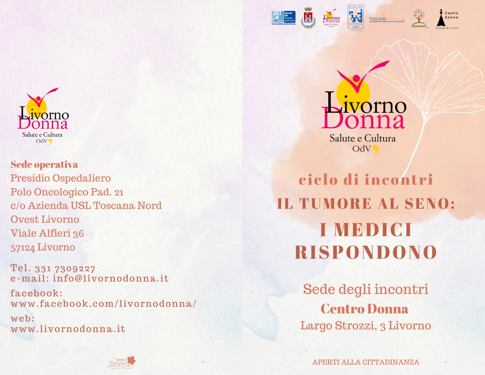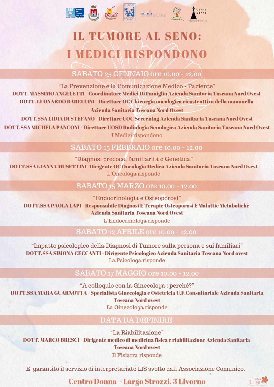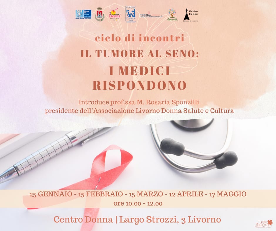 L’evento è il primo appuntamento del nuovo ciclo di incontri dell’iniziativa “Il tumore al seno: i medici rispondono” promossa dall’associazione “Livorno Donna Salute e Cultura” con il patrocinio dell’Azienda USL Toscana nord ovest e del Comune di Livorno che prevede complessivamente sei appuntamenti con professionisti dell’Azienda sanitaria che affronteranno il tema del tumore al seno da diversi punti di vista.