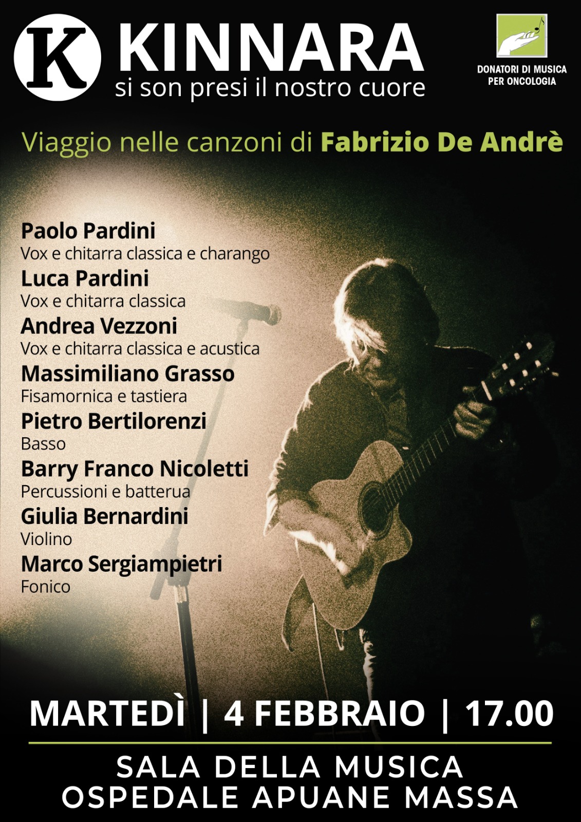 Massa, 3 febbraio 2025 – Un viaggio attraverso le canzoni di Fabrizio De Andrè. Lo proporranno domani (4 febbraio 2025) i Kinnara nella sala della musica dell’ospedale “Apuane” di Massa, con l’organizzazione, come al solito, dell’associazione dei Donatori di musica per l’Oncologia.