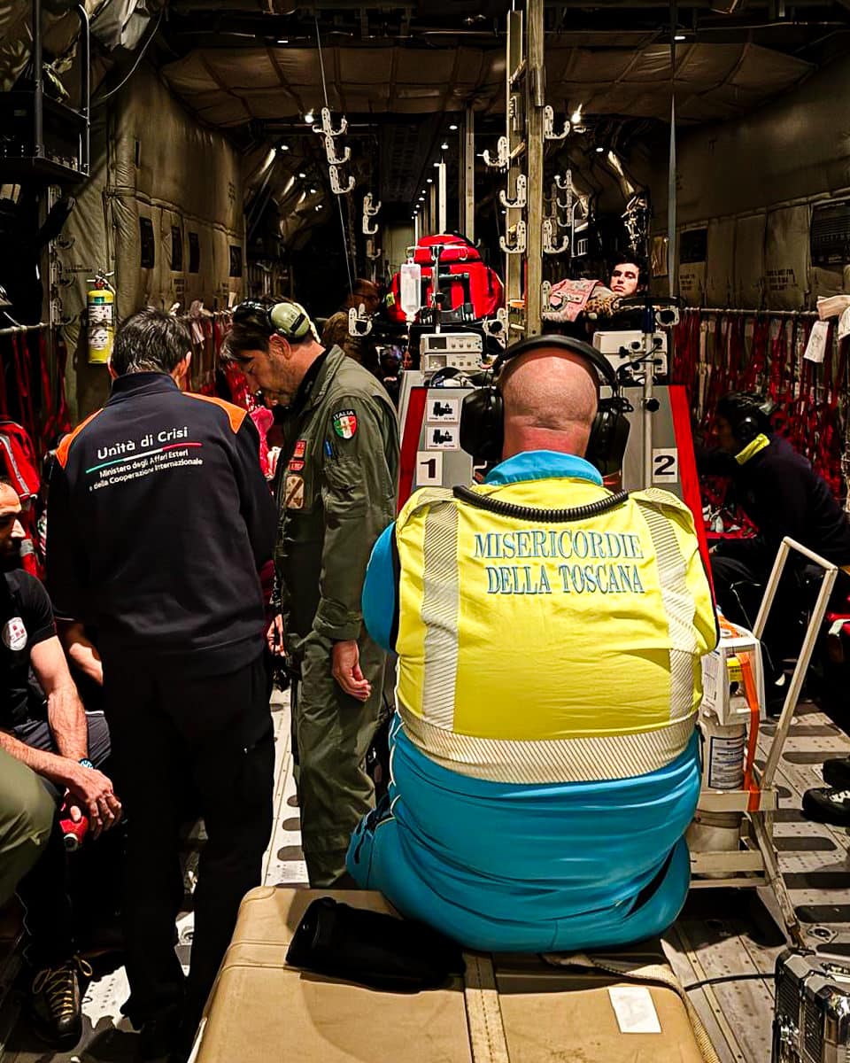 PISA, 26 febbraio 2025- L’infermiere Alessio Bimbi (Centrale Operativa 118 SUD Livorno-Pisa) e il medico anestesista Giacomo Morelli (Terapia Intensiva Ospedale Apuane e Servizio Elisoccorso Regionale) hanno partecipato alle missione “MedEvac” (Medical Evacuation) che ha visto il trasporto, dall’Egitto all’Italia attraverso un C-130J dell’Aeronautica Militare, di 14 minori palestinesi accompagnati che necessitavano di soccorso sanitario urgente a seguito della crisi umanitaria in corso a Gaza.