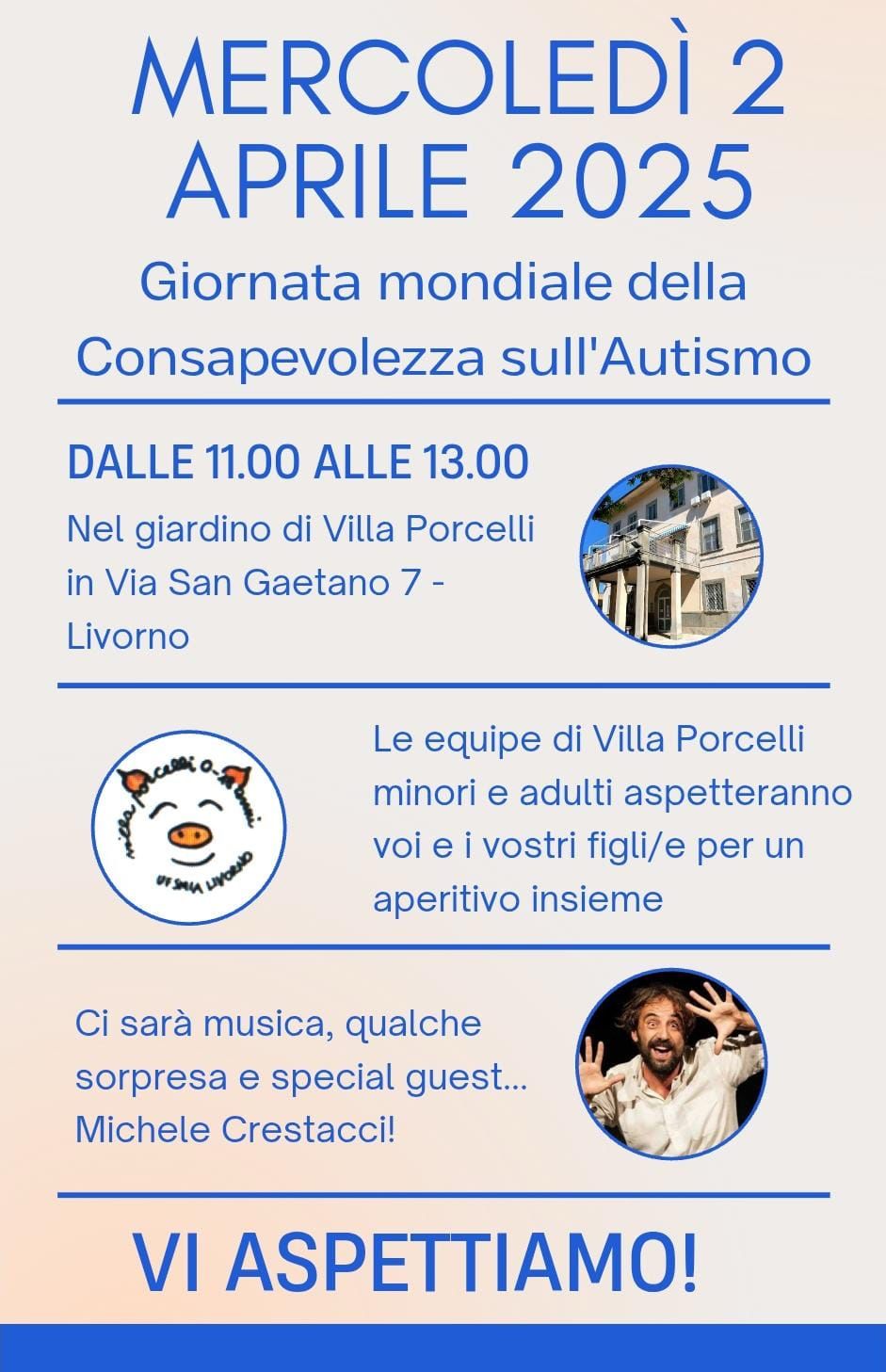 LIVORNO, 1° aprile 2025 – Domani mercoledì 2 aprile, in occasione della Giornata Mondiale di Consapevolezza dell’Autismo, il giardino di Villa Porcelli (Via San Gaetano 7, Livorno) aprirà le sue porte a bambini, ragazzi e giovani adulti che frequentano i Centri Diurni, insieme alle loro famiglie. L’iniziativa, che si terrà dalle 11 alle 13, mira a creare un momento di condivisione e sensibilizzazione, promuovendo l’inclusione e la consapevolezza sull’autismo.