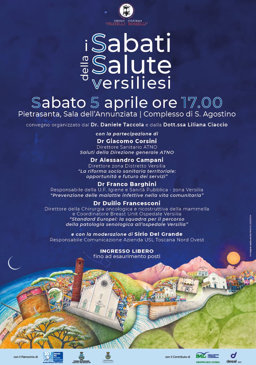 Il convegno, che verrà moderato dal giornalista Sirio Del Grande (Comunicazione Azienda USL Toscana nord ovest), conta sul patrocinio - oltre che della Asl - dei comuni di Pietrasanta e Seravezza e sul supporto della Banca Versilia Lunigiana e Garfagnana (gruppo BCC) e di Desal spa.