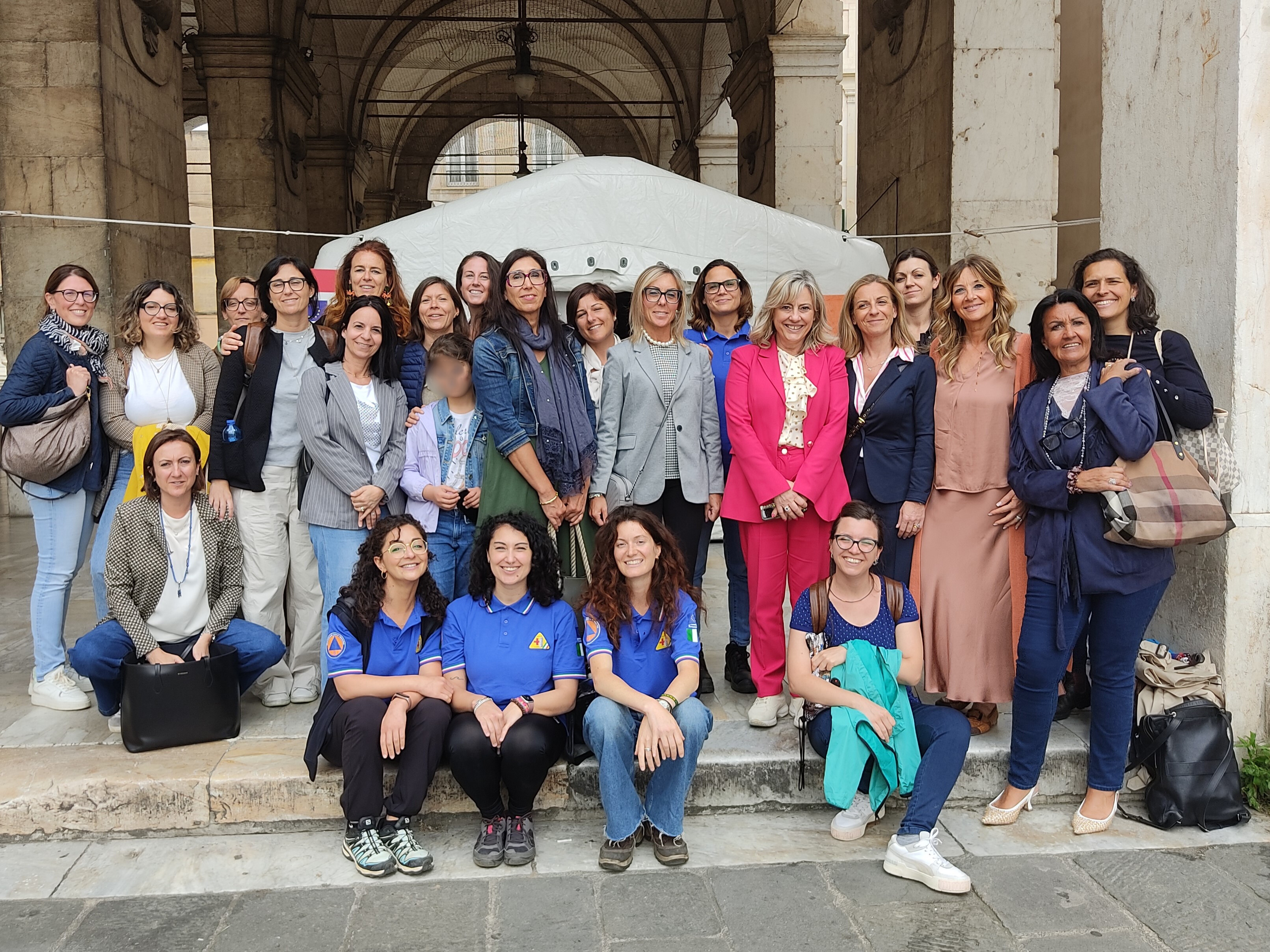 Gruppo: foto di gruppo dei partecipanti al termine dell'evento davanti all'ospedale da Campo allestito in logge dei Banchi.
