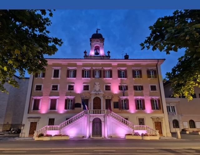 una foto della sede del Comune di Livorno illuminata di viola, colore della fibromialgia;