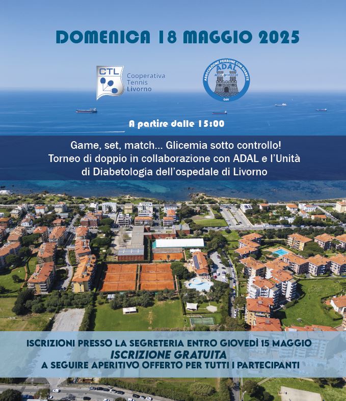 LIVORNO, 16 maggio 2025 – Si terrà domenica 18 maggio a partire dalle 15 al Circolo Tennis Livorno di Banditella il primo torneo di doppio “Game, set, match… Glicemia sotto controllo!” organizzato dall’Associazione Diabetici di Livorno (Adal) e dal reparto di Diabetologia guidato da Graziano Di Cianni. Tutti i partecipanti potranno utilizzare un sensore di monitoraggio glicemico per apprezzare gli effetti metabolici dello sport.