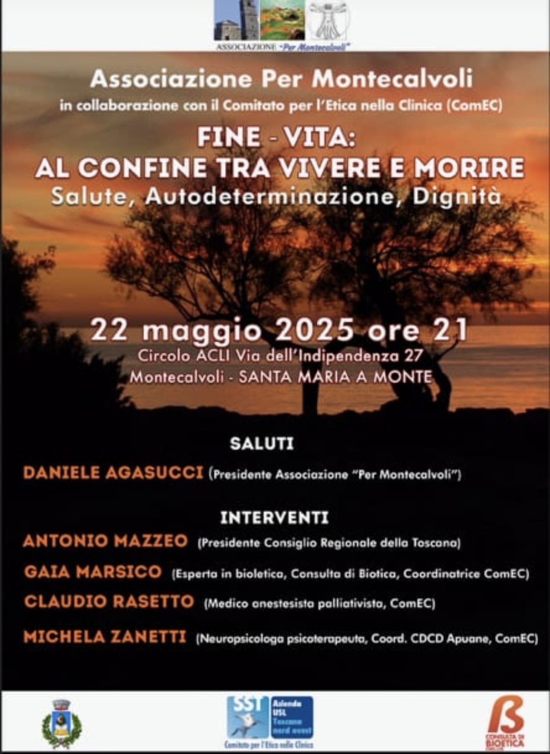 SANTA MARIA A MONTE, 20 maggio 2025 – Un confronto aperto e approfondito sul tema del fine vita, della salute, dell’autodeterminazione e della dignità della persona: è questo il cuore dell’iniziativa promossa dall’Associazione Per Montecalvoli, in collaborazione con il Comitato per l’Etica nella Clinica (ComEC), in programma giovedì 22 maggio 2025 alle ore 21 presso il Circolo ACLI di Via dell’Indipendenza 27, a Montecalvoli (Santa Maria a Monte). Il titolo dell’incontro – “Fine-vita: al confine tra vivere e morire” – richiama la delicatezza e la complessità di un tema che tocca da vicino i valori fondamentali della persona, il diritto alla cura, il rispetto della volontà individuale e l’accompagnamento nelle fasi terminali della vita.
