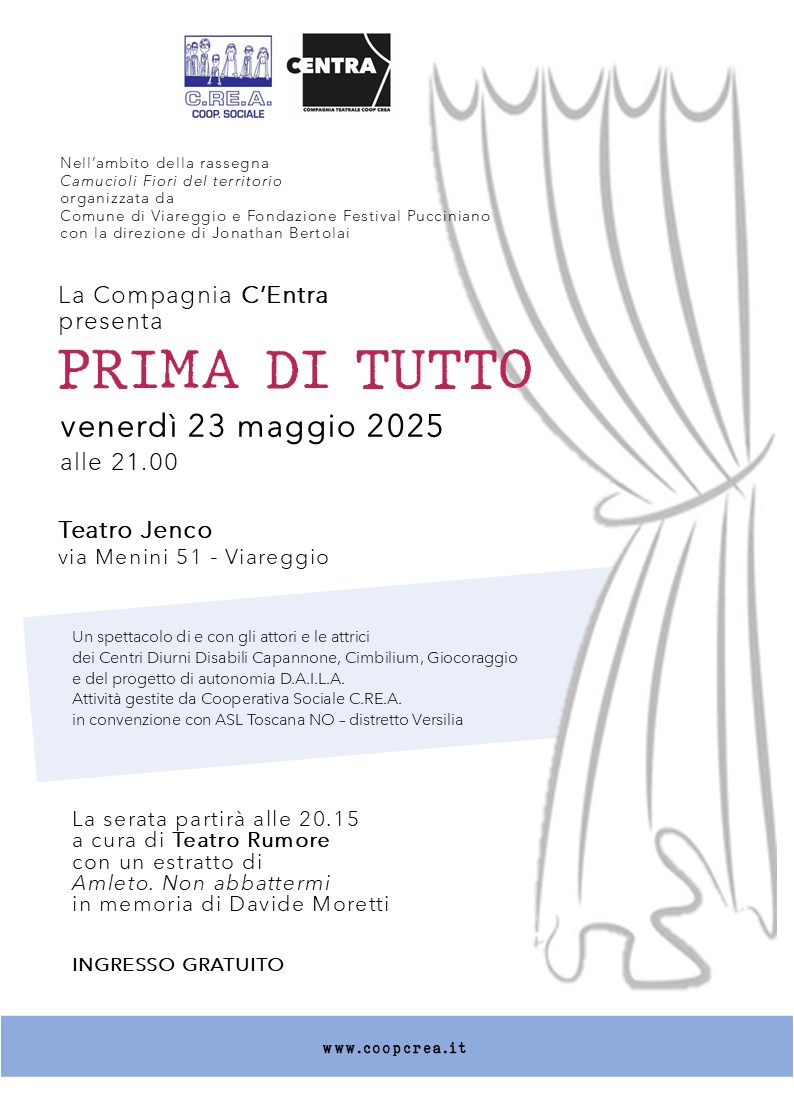 Viareggio, 21 maggio 2025 – Venerdì prossimo, 23 maggio, alle ore 21.00, al Teatro Jenco di Viareggio (via Menini 51), andrà in scena lo spettacolo "Prima di tutto", presentato dalla compagnia C'Entra, composta dagli attori e dalle attrici dei centri diurni disabili Capannone, Cimbilium, Giocoraggio e del progetto di autonomia D.A.I.L.A, attività gestite dalla cooperativa sociale C.RE.A. in convenzione con l'Azienda USL Toscana nord ovest - Zona distretto Versilia. Testi di Serena Del Cima, Leonardo Palmerini e Giacomo Bicchieri. Regia di Paolo Simonelli