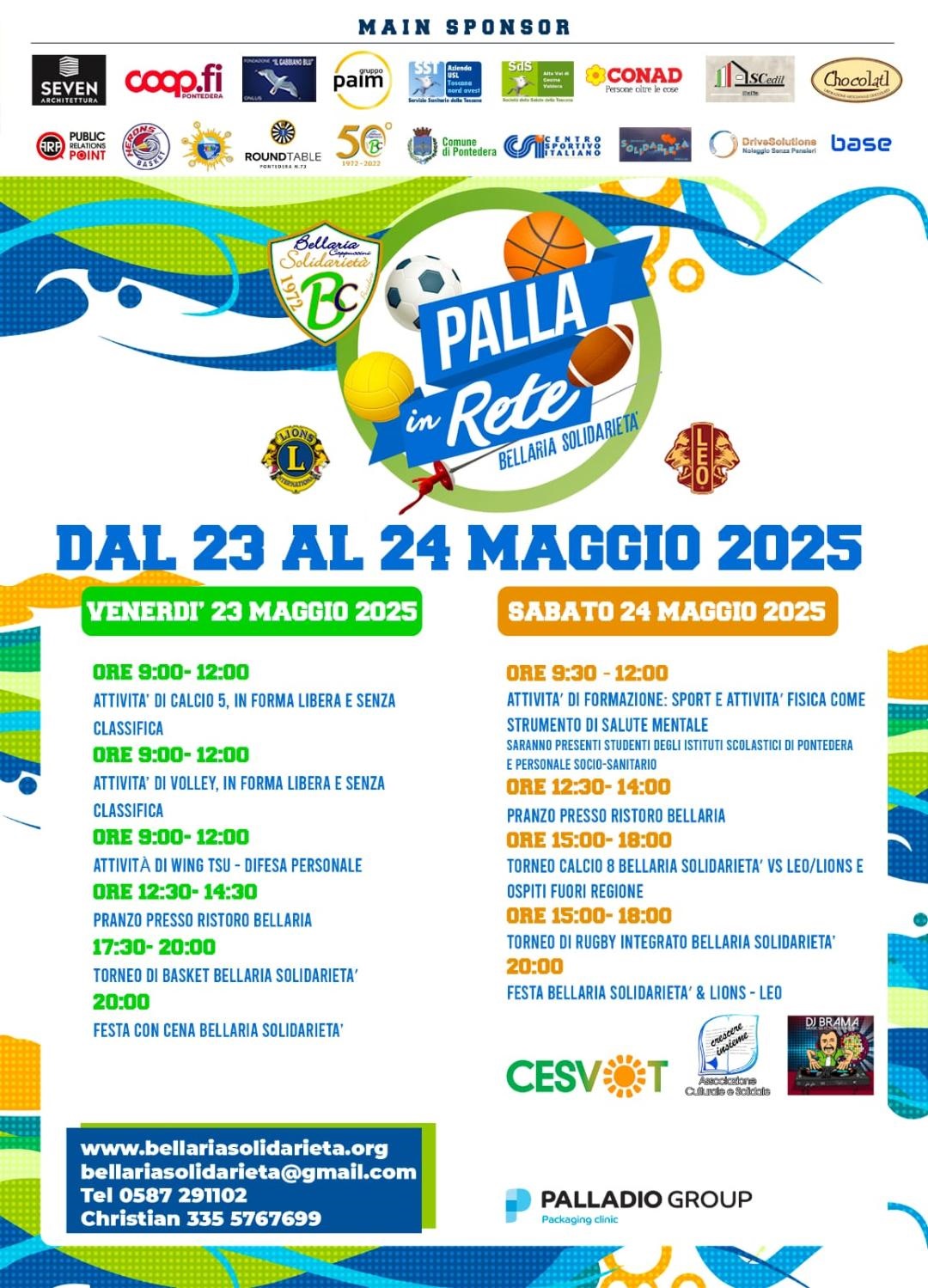 Pontedera, 22 maggio 2025 – Anche l’Azienda USL Toscana nord ovest sarà tra i main sponsor all’evento “Palla in rete”, organizzato da Bellaria Solidarietà, che si terrà venerdì 23 e sabato 24 maggio agli impianti della Polisportiva Bellaria a Pontedera.