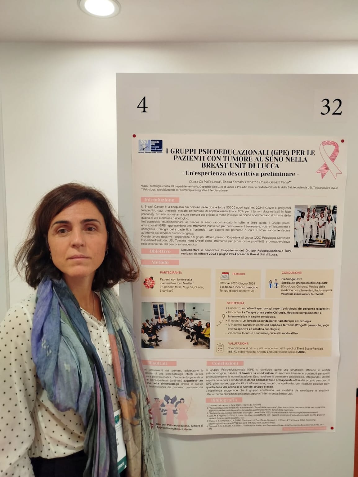 Le ricerche presentate dalla dottoressa Da Valle – intitolati “La psicoterapia di gruppo con pazienti con tumore alla mammella e la paura della recidiva: unmet needs” e “I gruppi psicoeducazionali per le pazienti con tumore alla mammella nella Breast Unit di Lucca” – rappresentano due tappe significative di un percorso di ricerca-intervento sviluppato nel tempo, finalizzato a migliorare la qualità della vita delle donne e l’efficacia complessiva della presa in carico oncologica.