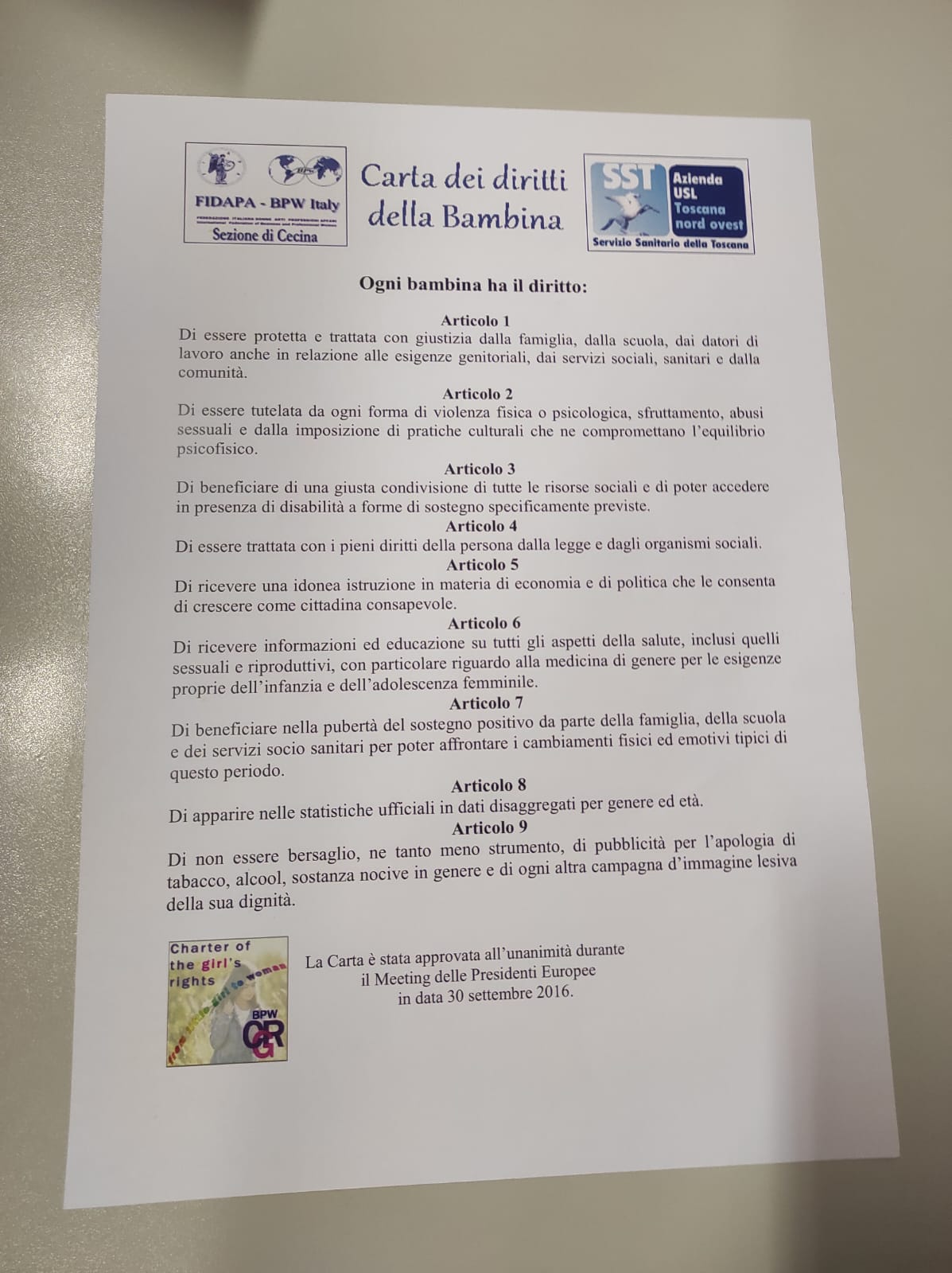 A seguire si è svolta la cerimonia dedicata alla consegna della Carta dei diritti delle Bambine, promossa dalla sezione Fidapa di Cecina, rappresentata dalla presidente Elvia Vispi, dalla past president Ornella Fabbri, dalla segretaria Lisetta Lastrucci e dalla segretaria esecutivo Arianna Veracini. La presidente ha ricordato l’importanza di questo strumento educativo: “I diritti delle bambine sono fondamentali e richiedono attenzione specifica, perché il modo di crescere e di approcciare la vita non è uguale per tutti. Abbiamo voluto donare la Carta a questo reparto perché è un luogo di educazione e di rispetto, in cui il tema va affrontato fin dalla nascita. È rivolta alle giovani mamme, alle figlie femmine, ma anche ai maschi, perché la consapevolezza dei diritti deve essere condivisa”.