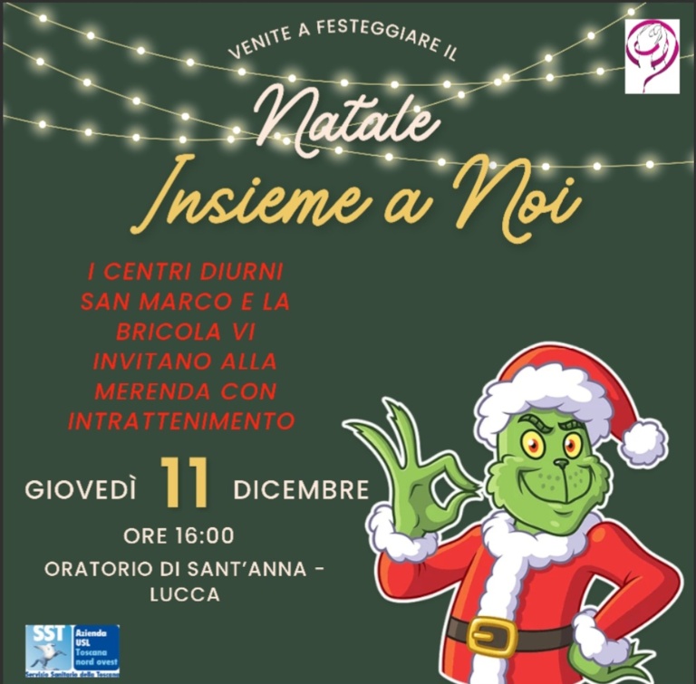 LUCCA, 9 dicembre 2025 – Il Centro Attività diurne La Bricola e il Centro diurno San Marco, servizi della Salute mentali adulti di Lucca, invitano la comunità a partecipare alla festa natalizia “Natale insieme a Noi – Una comunità che si incontra”, in programma giovedì 11 dicembre alle ore 16 nella sede dell’Oratorio di Sant’Anna a Lucca.