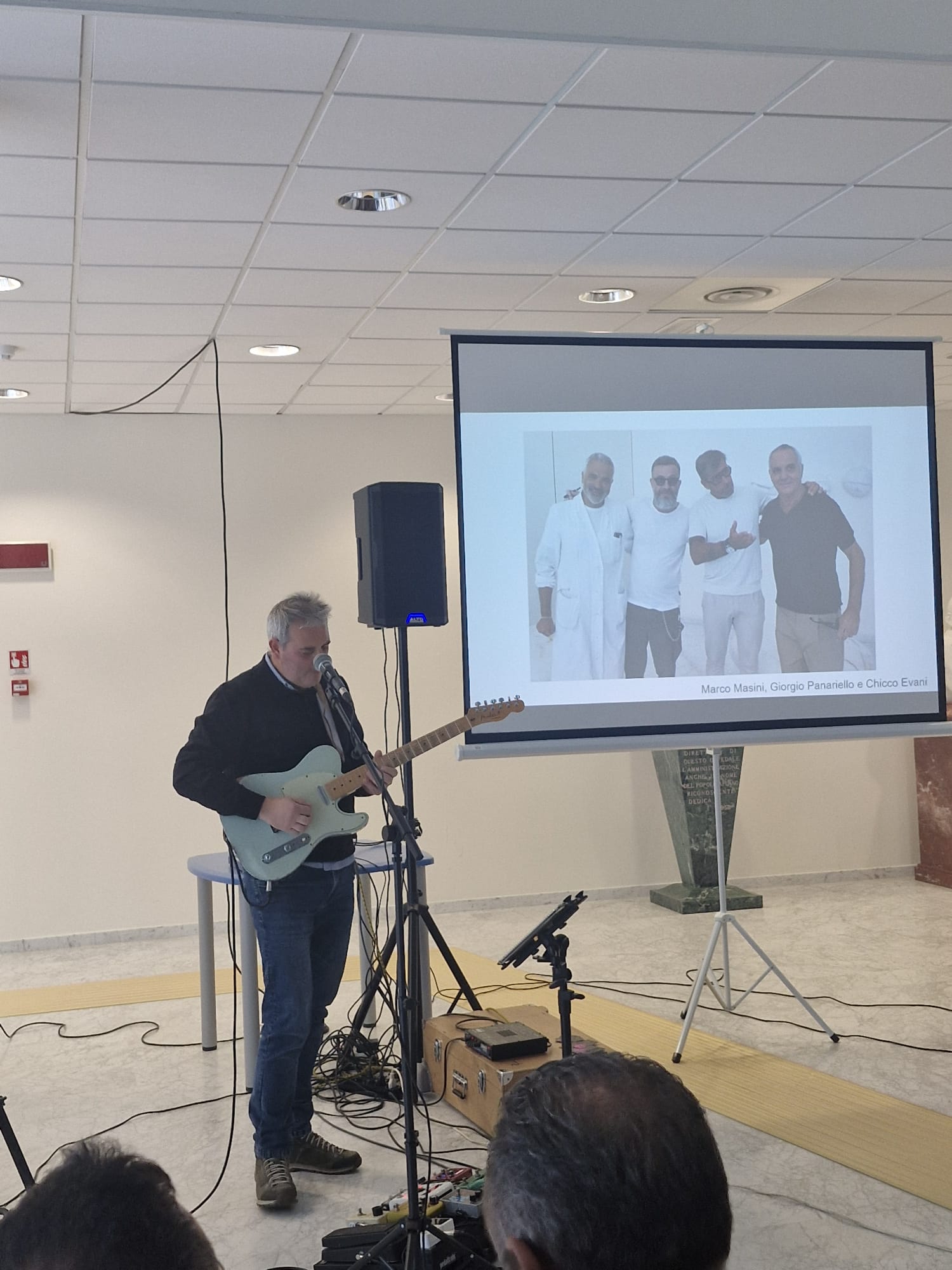 L’evento è stato allietato dai virtuosismi alla chitarra elettrica di Luca Bertone, importante artista che si è esibito in vari eventi e festival Blues, docente di Accademia musicale. La sua esibizione, da autentico “One man band”, è stata preceduta dall’introduzione di Andrea Mambrini, che ha illustrato il progetto “Donatori di musica”, che in 18 anni ha permesso di organizzare solo a Massa Carrara centinaia di concerti, per i pazienti, i familiari e gli operatori dell’ospedale Apuane.