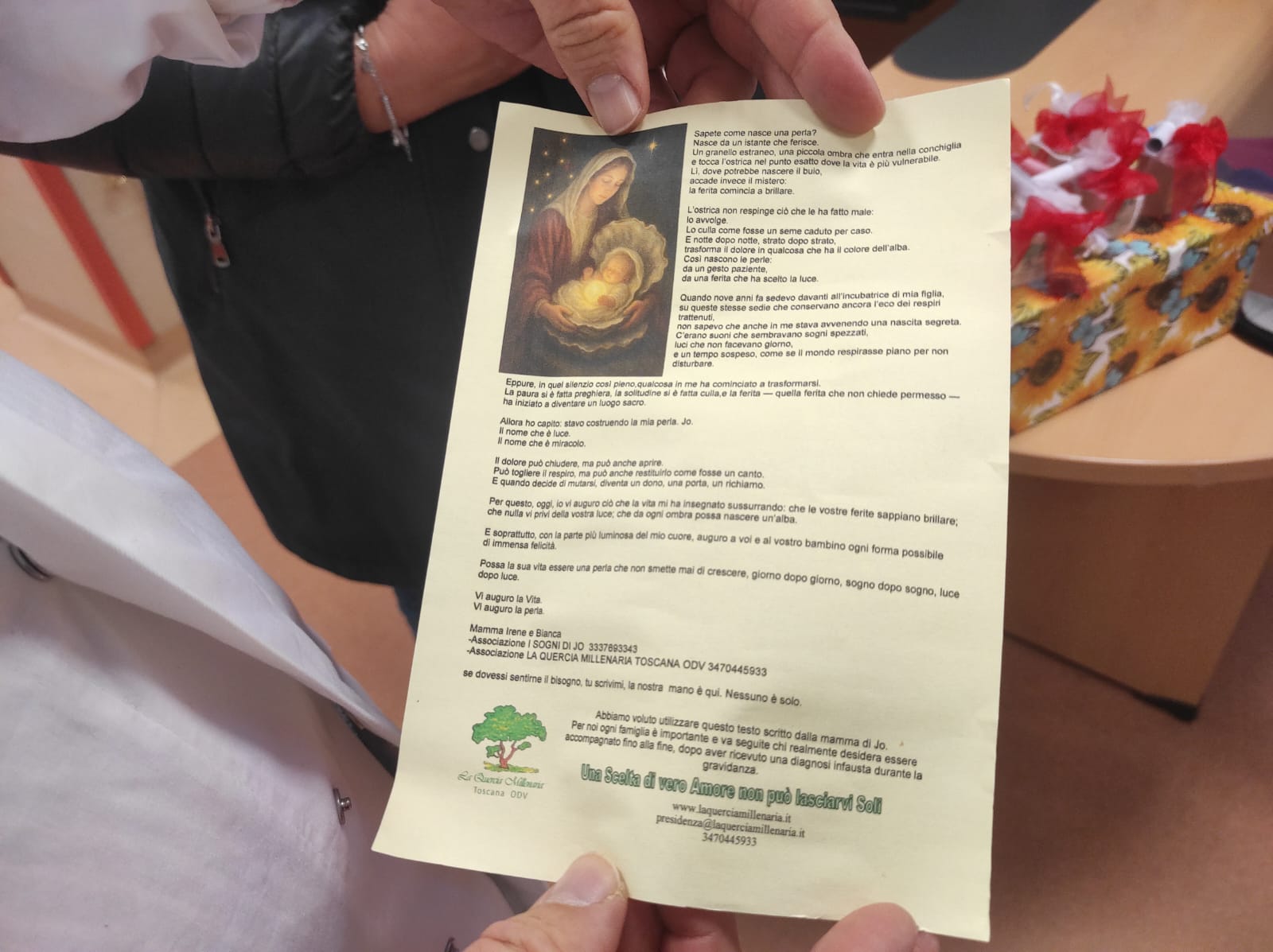"La nostra associazione – ha sottolineato la presidente De Pascalis – è a disposizione del reparto e di tutte le donne e le famiglie che sentano il bisogno di un supporto. Offriamo aiuto per attraversare momenti dolorosi, ma anche per custodire e dare valore a quelli belli, che restano parte della storia di ciascuno. L’associazione, contattabile attraverso il proprio sito internet e i canali social, opera da anni per offrire un sostegno umano, psicologico, spirituale e medico alle famiglie coinvolte in percorsi complessi e dolorosi, promuovendo un modello di accoglienza ed è rivolta alla tutela della vita nascente e alla maternità, nel rispetto dei tempi, dei bisogni e delle emozioni delle persone”.