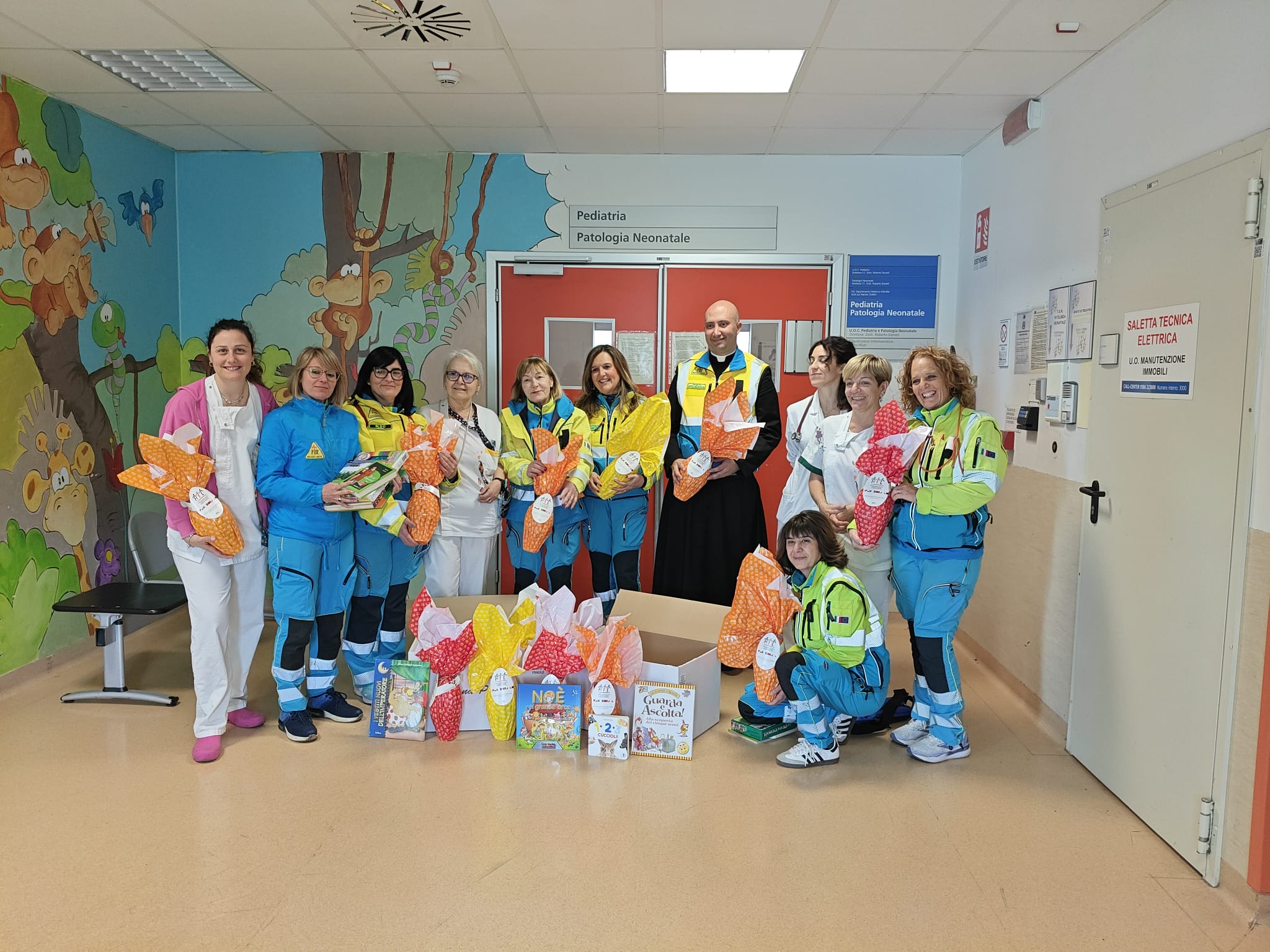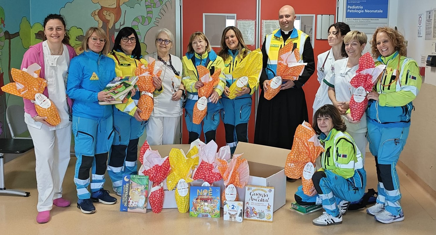 Nella foto la consegna dei doni da parte di alcuni volontari: https://www.uslnordovest.toscana.it/comunicati-stampa/16670-pasqua-2026-in-pediatria-le-uova-di-ail-portate-dalla-misericordia-di-livorno.