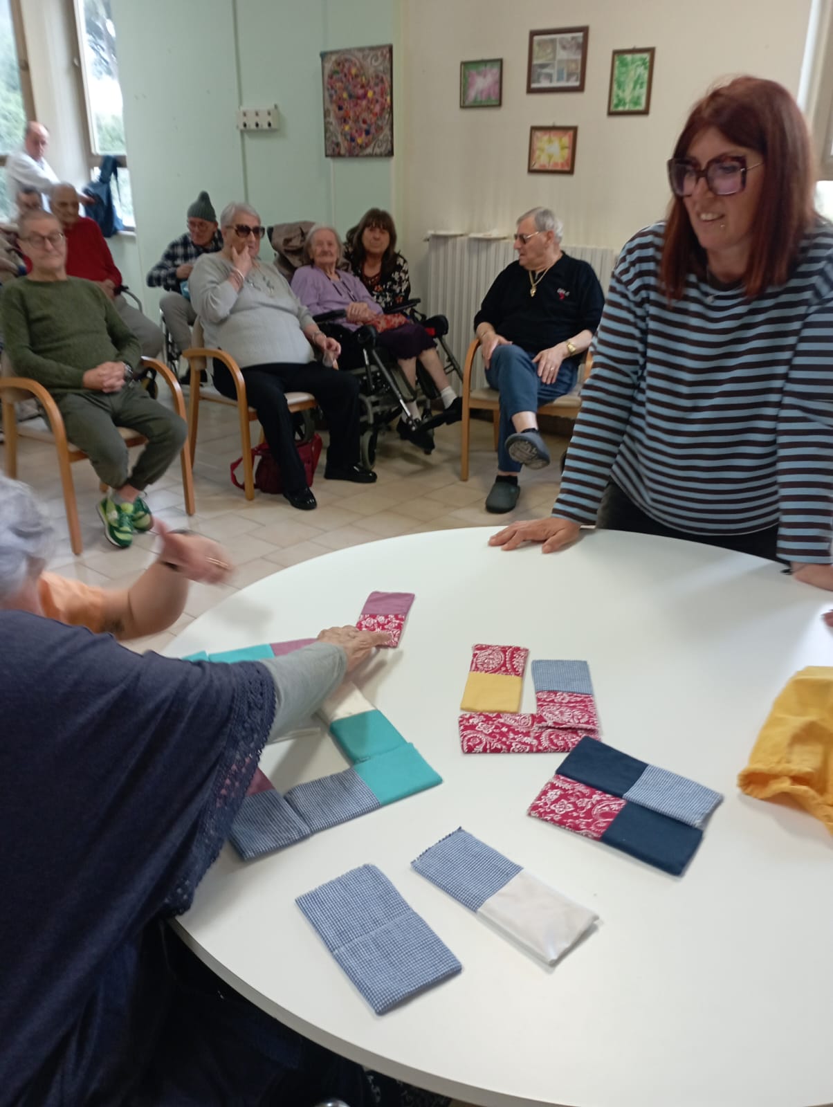 Al centro dell’iniziativa la donazione di giochi realizzati a mano con materiali di recupero – memory, domino in tessuto, percorsi sensoriali e strumenti per la coordinazione – pensati per stimolare le capacità cognitive e relazionali degli ospiti, con particolare attenzione alle persone con fragilità o decadimento cognitivo. Ma il progetto, nel corso delle tappe, si è evoluto andando oltre la semplice consegna dei materiali, trasformandosi in un’occasione concreta di coinvolgimento diretto degli anziani.