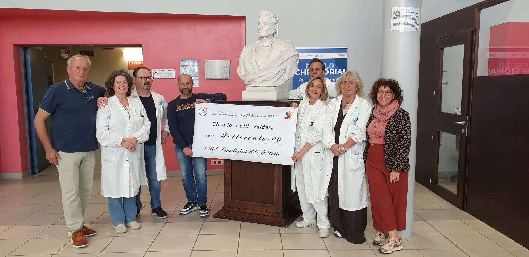 Pontedera, 27 aprile 2026. Un gesto concreto a sostegno dei pazienti dializzati dell’ospedale di Pontedera. Nella giornata di giovedì 23 aprile, il circolo “Lotti Valdera” ha consegnato all’Associazione nazionale emodializzati dialisi e trapianto (Aned) il ricavato della lotteria di Pasqua 2026, pari a 700 euro. La somma sarà utilizzata per l’acquisto di attrezzature destinate a migliorare l’assistenza all’interno del reparto di Nefrologia e dialisi.