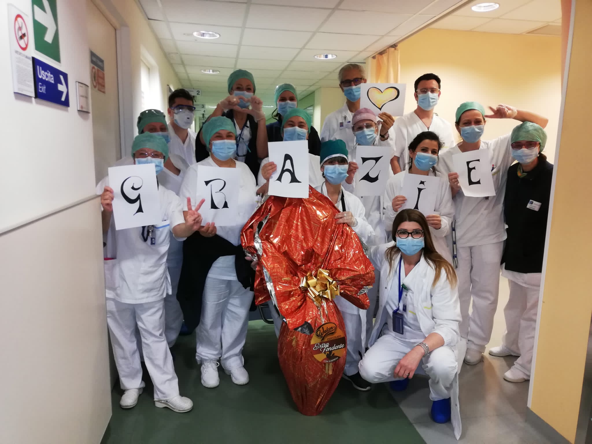 Anche nella Radioterapia oncologica dell’ospedale “San Luca” di Lucca è arrivato un enorme uovo di cioccolato donato dal Supermarket SIGMA di Segromigno in Monte. Un attimo di allegria e condivisione, oltre al riconoscimento del lavoro svolto dagli operatori. Gabriella e Alessandra hanno così fatto gli auguri di Buona Pasqua a tutti gli operatori: “In questi momenti così difficili da sostenere, il vostro costante impegno non ci ha mai fatto sentire cittadini e uomini soli. Per questo motivo vi ringraziamo dal profondo del cuore perché ci siete ogni giorno per tutti ed insieme ce la faremo!”. Il direttore della Radioterapia oncologica, dottor Marcello Mignogna, insieme a tutto il personale ringraziano per questo dolce omaggio ed anche per le squisite pizze che la Pizzeria La Cicala di Altopascio ha offerto al reparto, donando preziosi momenti di relax a tutti gli operatori.