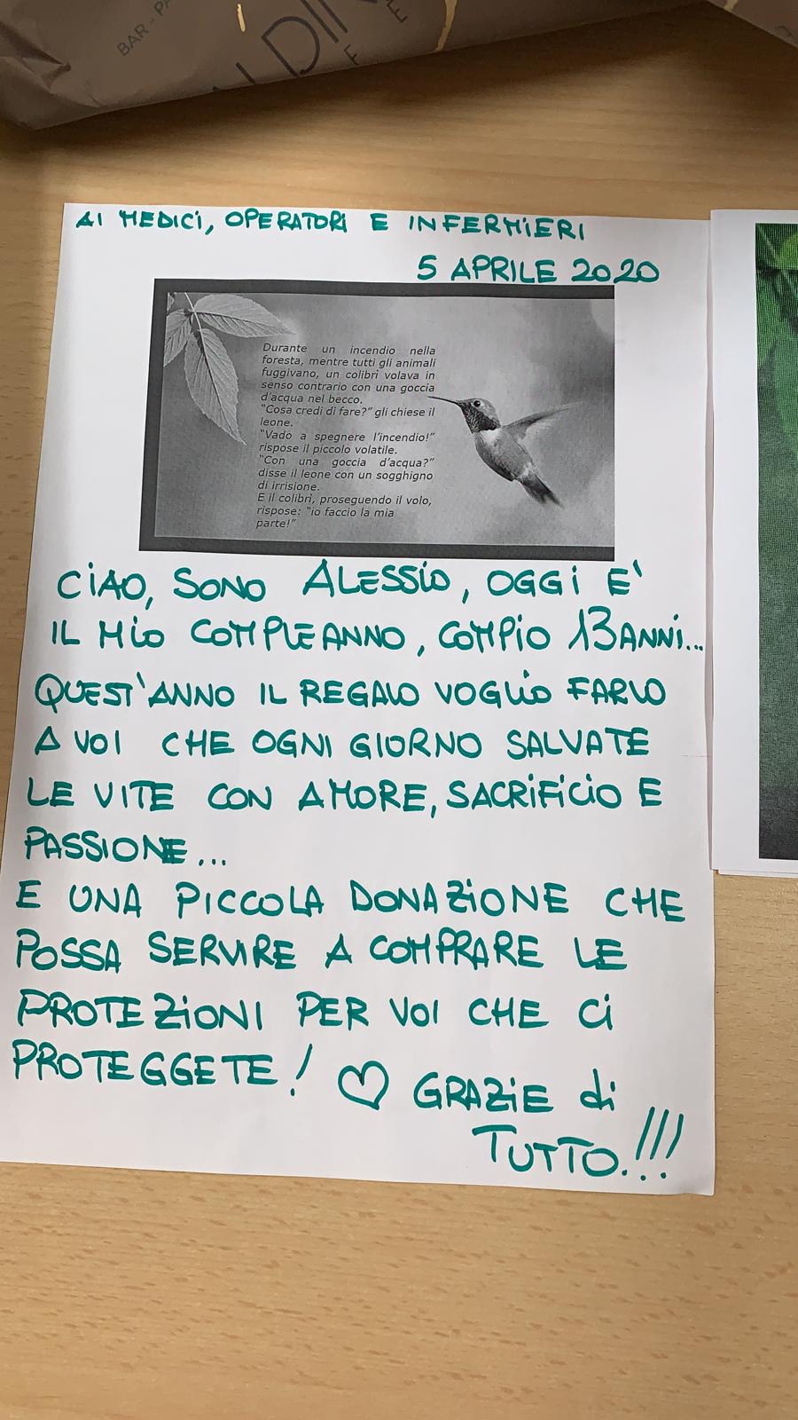 Una donazione che ha fatto particolarmente piacere al personale è stata quella di Alessio, un ragazzo di 13 anni che nel giorno del suo compleanno ha donato due vassoi di pasticcini al personale del 118 e del pronto soccorso (il dono è accompagnato da un messaggio e una poesia, vedi foto in allegato).
