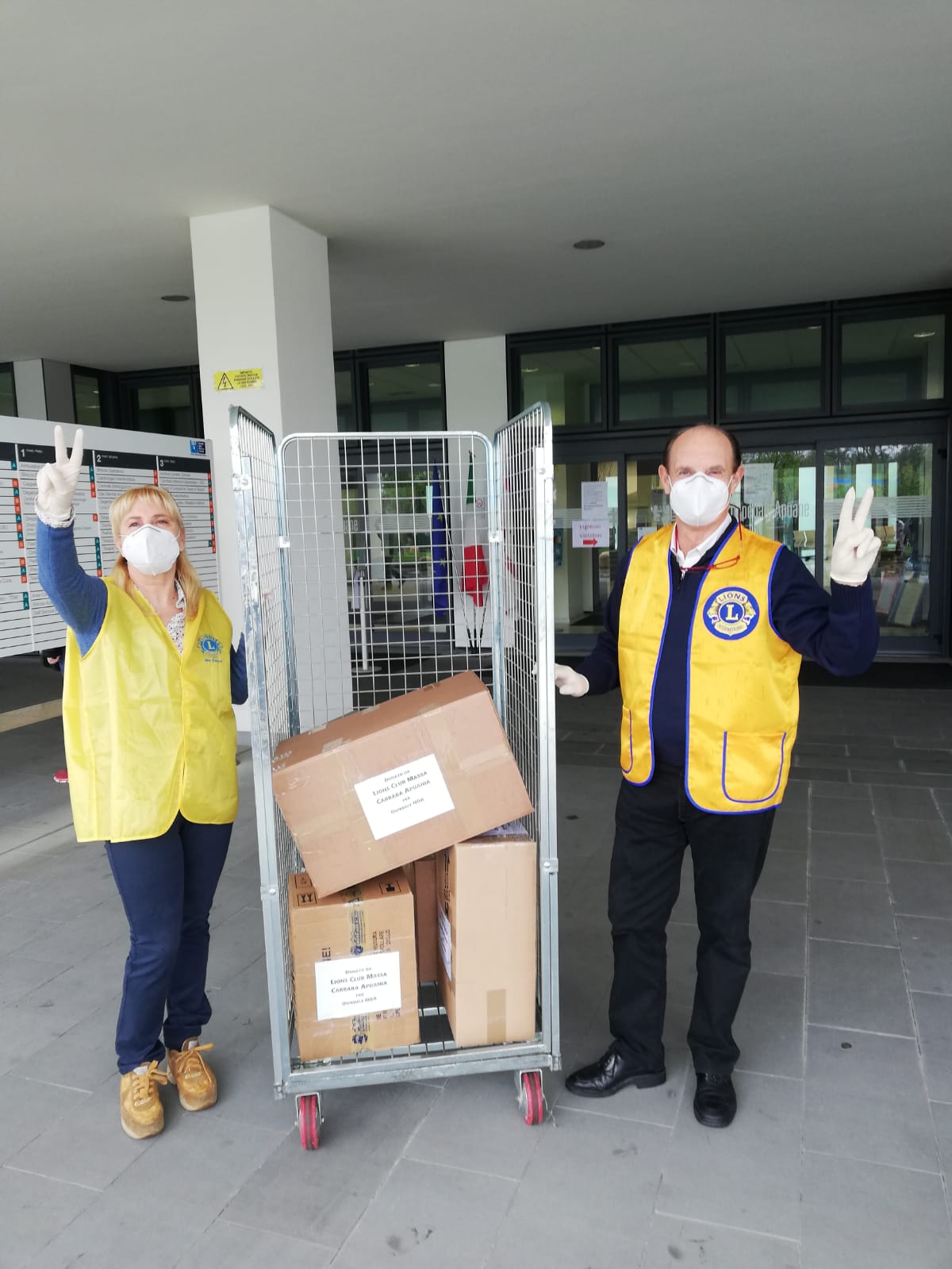 Massa, 20 aprile 2020 - Continua la solidarietà verso l'ospedale Apuane; oggi ulteriori nuove consegne di dispositivi di protezione individuali da parte del Lions club di Massa e Carrara (nella foto il momento della consegna del dott. Massimo Pantani, presidente Lions e della sua consorte, dott.ssa Maria Rita Guadagni) e dell'Associazione Nuoto UISP di Massa e Carrara.