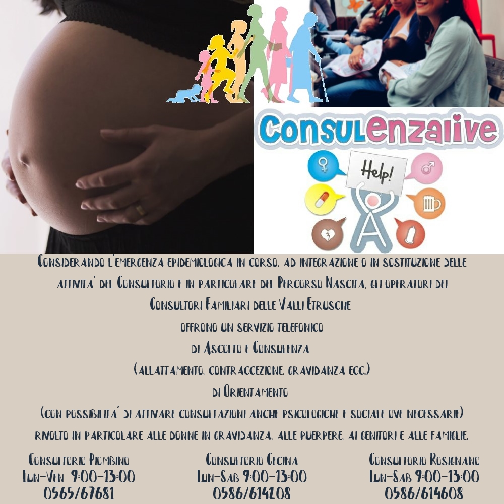 COME FUNZIONA. Per accedere al servizio è necessario chiamare i consultori di Piombino (0565-67681 dal lunedì al venerdì dalle 9 alle 13) oppure di Cecina e Rosignano (0586-614.208 e 0586-614.608 dal lunedì al sabato dalle 9 alle 13) per chiedere di poter partecipare agli incontri. Il servizio è rivolto a tutta la popolazione per richieste di ascolto o consulenze telefoniche e online, ma in particolar modo alle donne in gravidanza per accompagnamento alla nascita, nel post partum e durante l'allattamento al seno.
