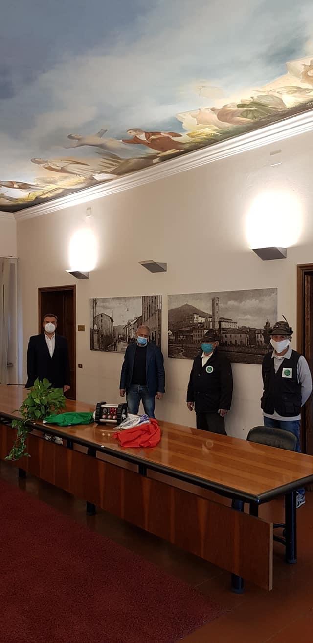 3 maggio 2020 - Il primo maggio scorso nella sala del consiglio comunale di Porcari il gruppo Alpini del paese - con il capogruppo Adolfo Baldacci e con il consigliere Luciano Giannini - ha consegnato al direttore di zona distretto Piana di Lucca dell’Asl Toscana nord ovest Luigi Rossi un importante strumento di lavoro: un ventilatore polmonare non invasivo per adulti e bambini.