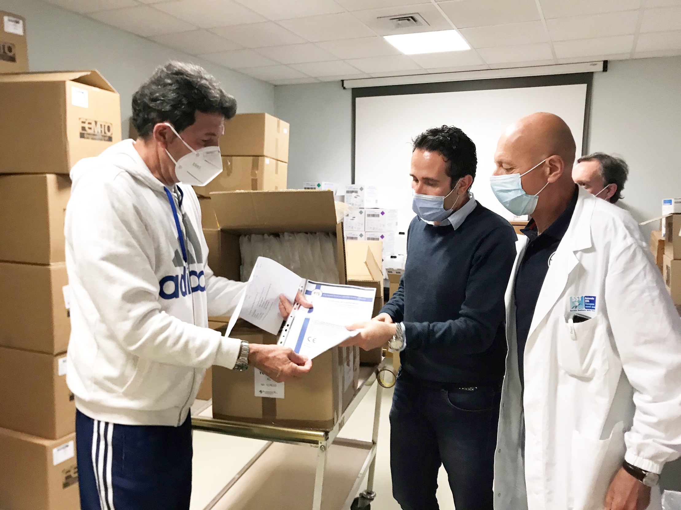 Versilia, 7 maggio 2020 - La Fondazione Niccolò Galli di Firenze ha donato mascherine FFP2 all'ospedale Versilia. La consegna è avvenuta nei giorni scorsi, quando a donare i dispositivi di protezione per il personale sanitario è stato il presidente della Fondazione, Giovanni Galli, ex portiere di squadre di calcio di Serie A come Fiorentina, Milan Torino, Napoli e Parma e della Nazionale italiana. A ricevere le mascherine sono stati Giacomo Corsini, direttore dell'ospedale Versilia, e Franco Marsili, direttore della struttura di Dermatologia dell'ospedale Versilia. (dp)