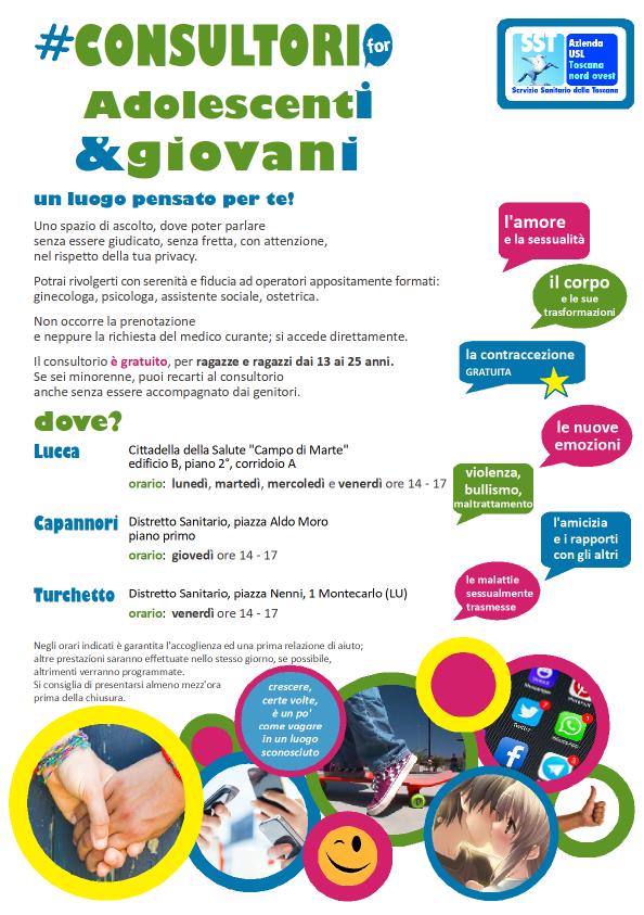 Per il Consultorio giovani è possibile rivolgersi oltre a Campo di Marte anche su Capannori il giovedì dalle 14.00 alle 17.00 e su Turchetto il venerdì dalle 14.00 alle 17.00.
